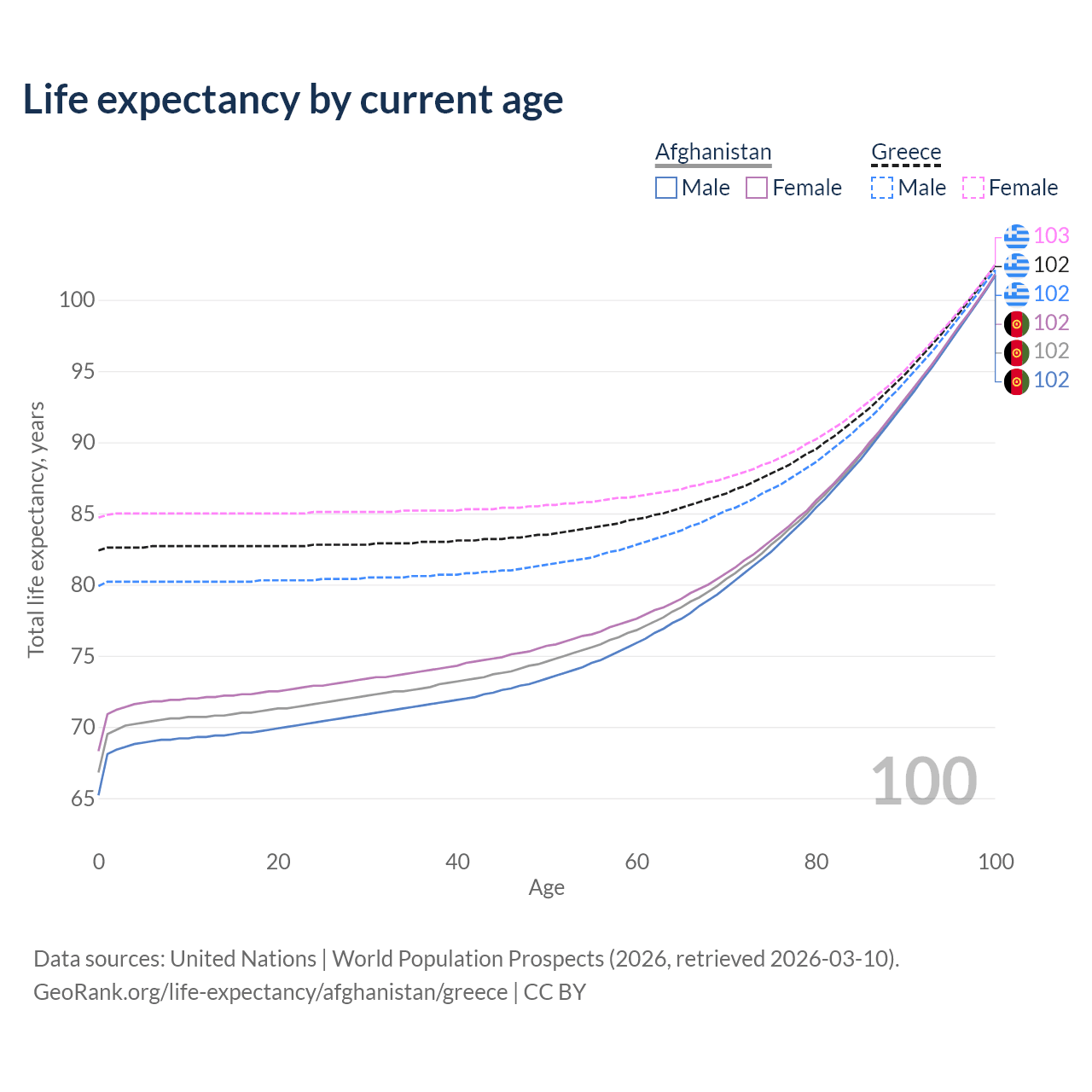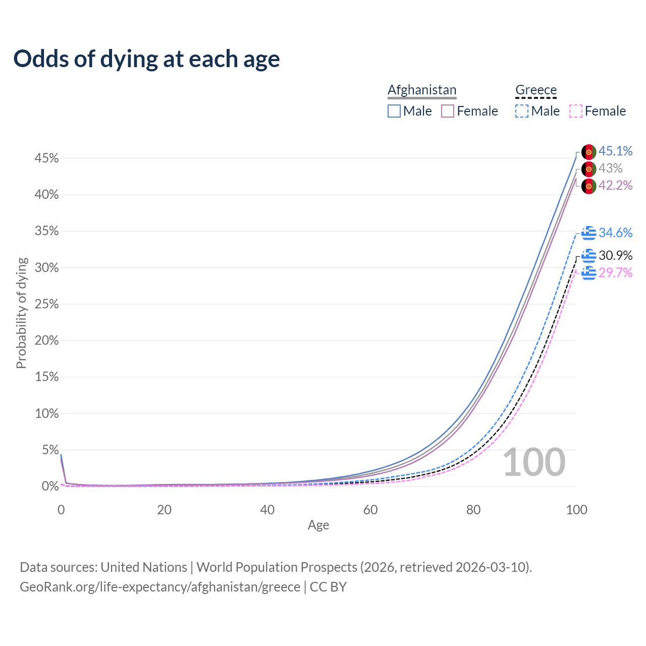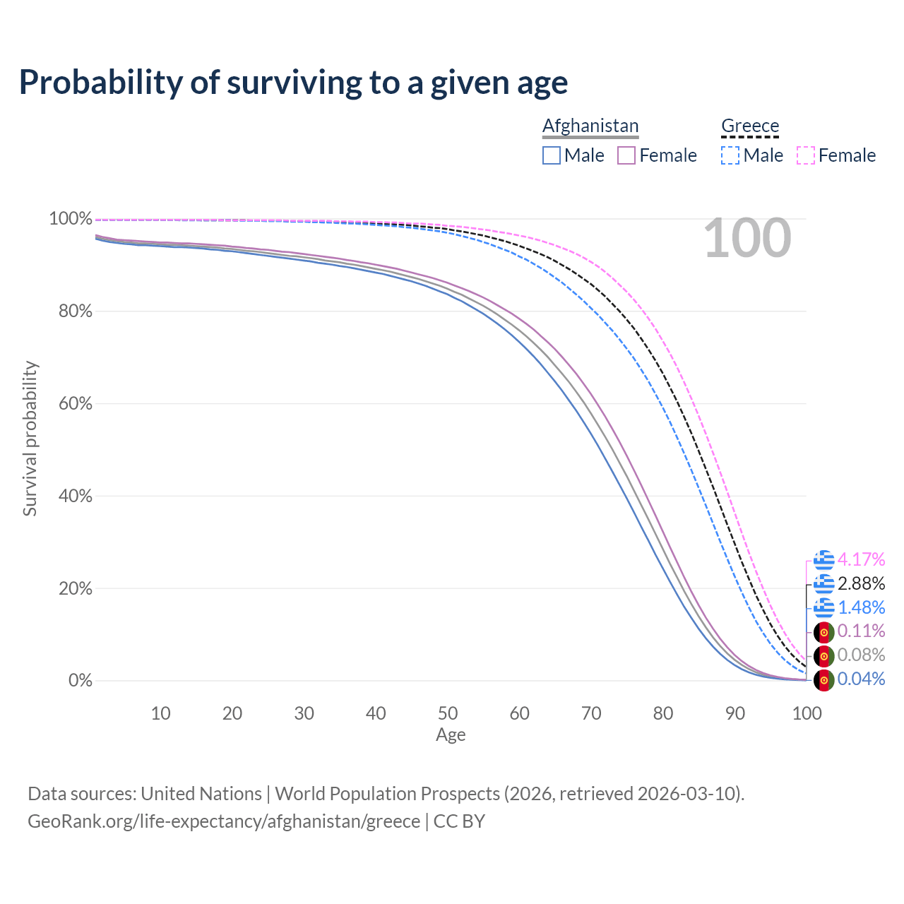 This life expectancy calculator shows the odds of living to 100, 95, 90, and below based on current age for both males and females in Afghanistan and Greece, along with mean and median age of death. The calculations are based on the 2026 life tables (actuarial tables) from the UN World Population Prospects.