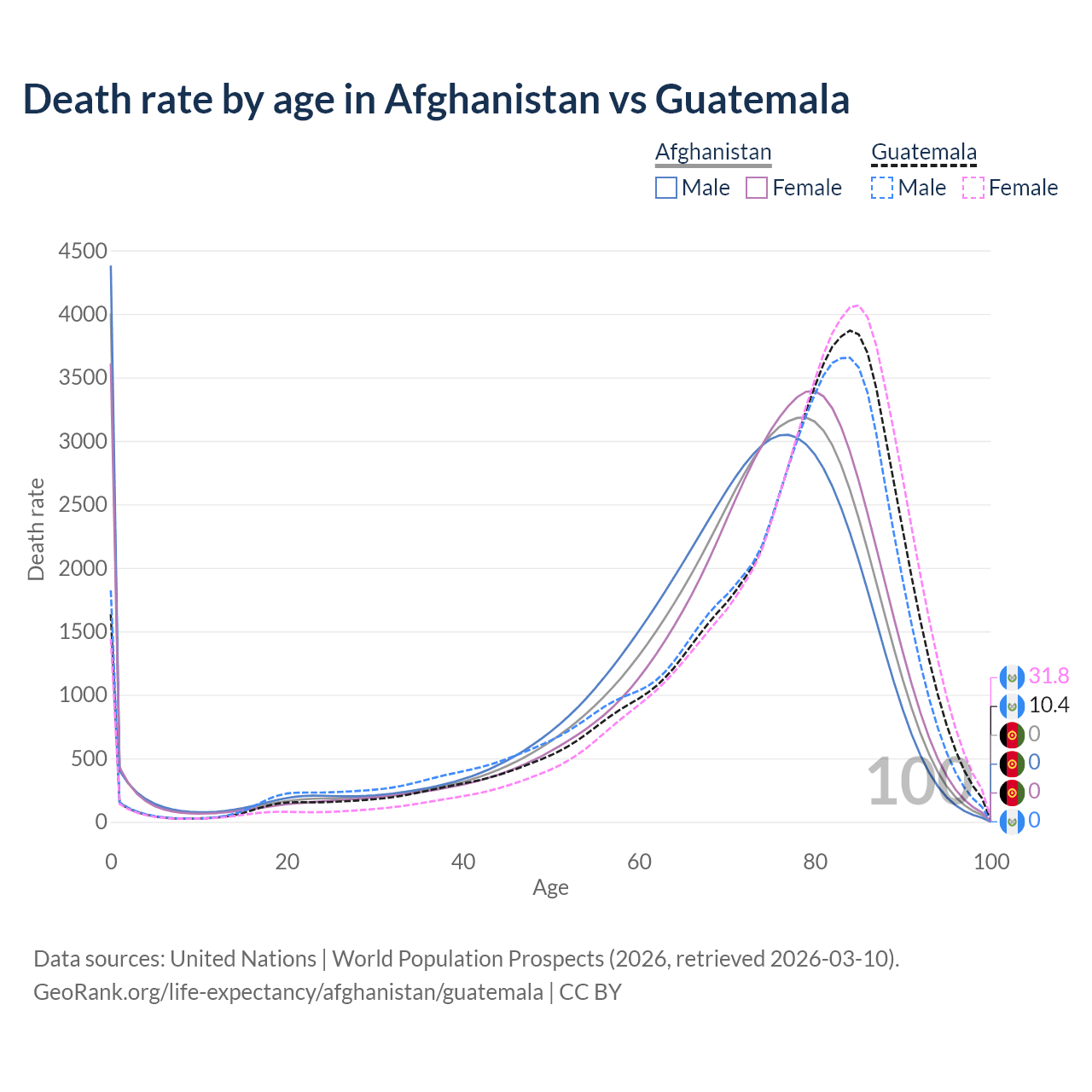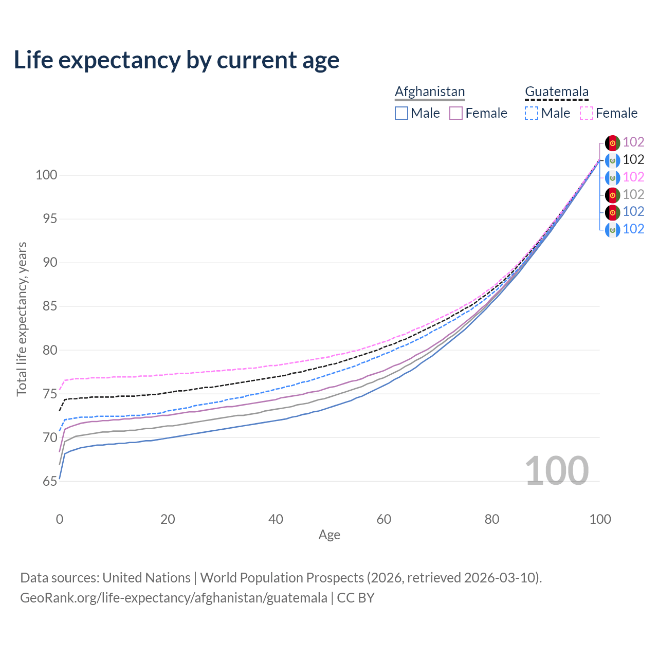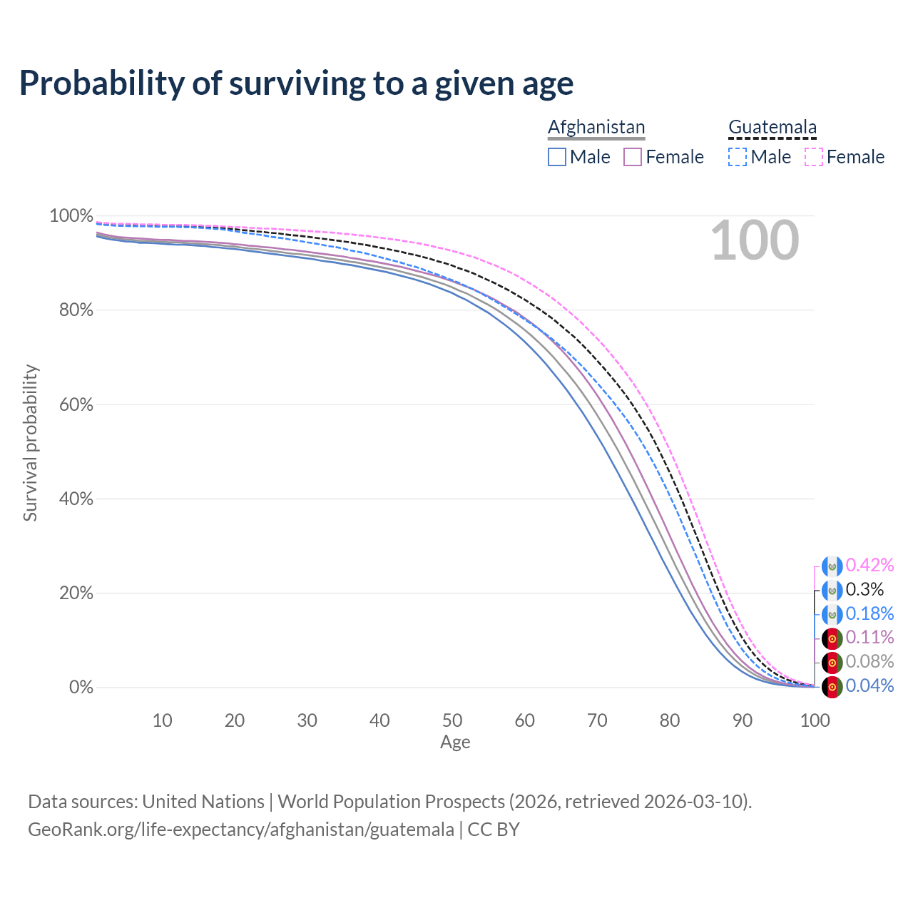 This life expectancy calculator shows the odds of living to 100, 95, 90, and below based on current age for both males and females in Afghanistan and Guatemala, along with mean and median age of death. The calculations are based on the 2026 life tables (actuarial tables) from the UN World Population Prospects.