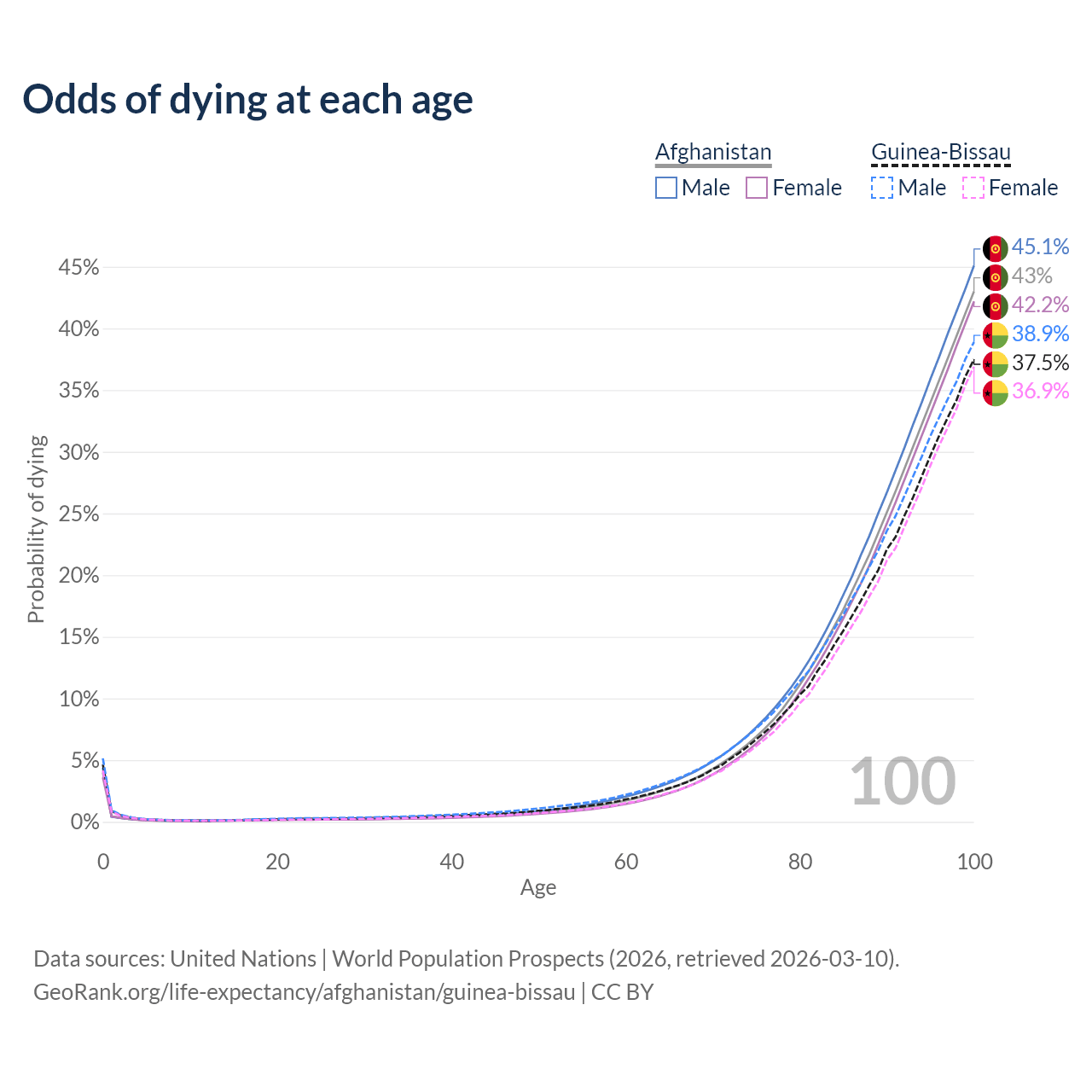 This life expectancy calculator shows the odds of living to 100, 95, 90, and below based on current age for both males and females in Afghanistan and Guinea-Bissau, along with mean and median age of death. The calculations are based on the 2026 life tables (actuarial tables) from the UN World Population Prospects.