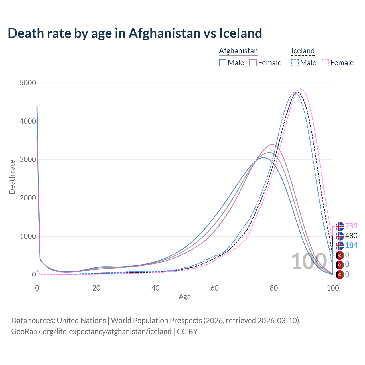 In Afghanistan, the most common age of death is 0, compared to 88 in Iceland. The median age of death is 73 in Afghanistan and 85.9 in Iceland, meaning only half of each cohort is expected to live past that age.