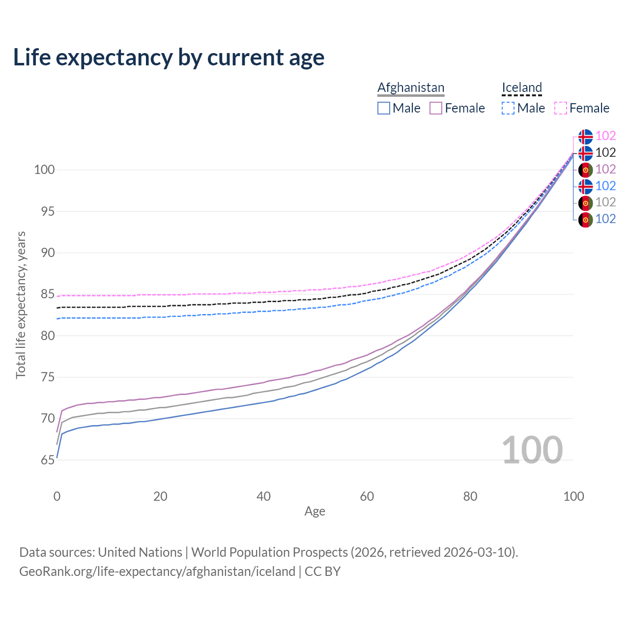This life expectancy calculator shows the odds of living to 100, 95, 90, and below based on current age for both males and females in Afghanistan and Iceland, along with mean and median age of death. The calculations are based on the 2026 life tables (actuarial tables) from the UN World Population Prospects.