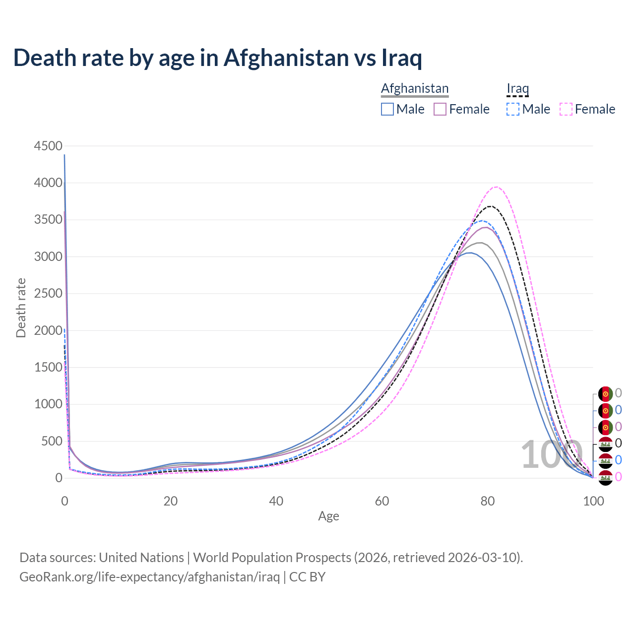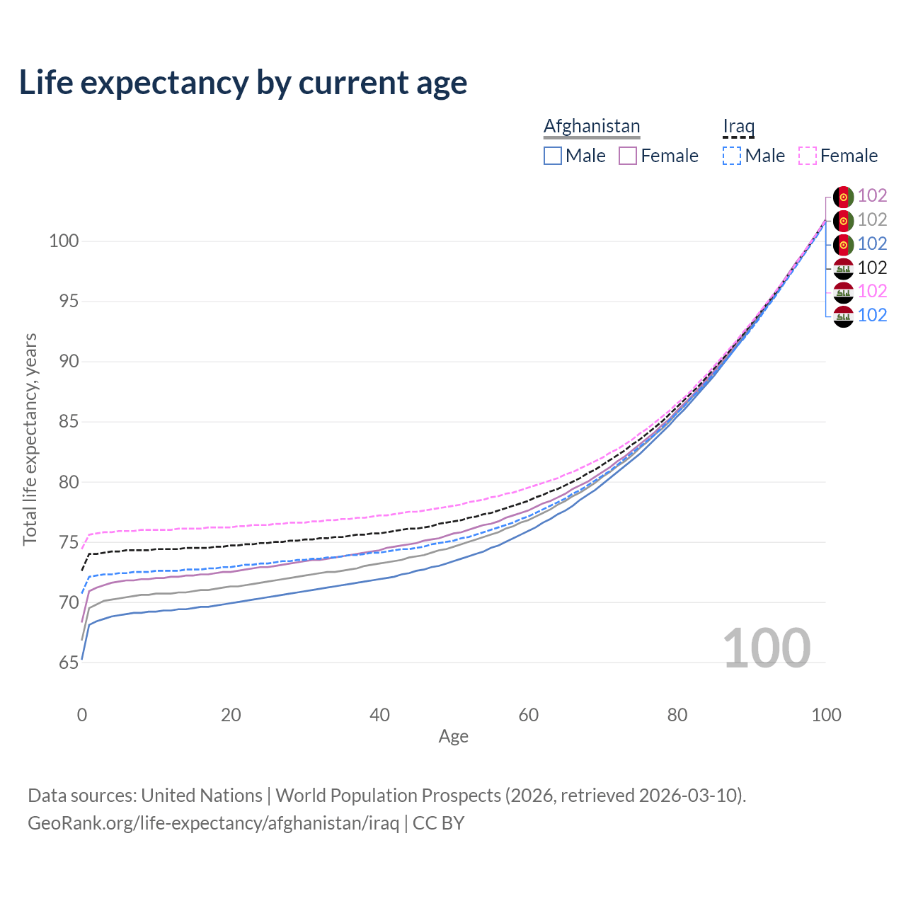 This life expectancy calculator shows the odds of living to 100, 95, 90, and below based on current age for both males and females in Afghanistan and Iraq, along with mean and median age of death. The calculations are based on the 2026 life tables (actuarial tables) from the UN World Population Prospects.