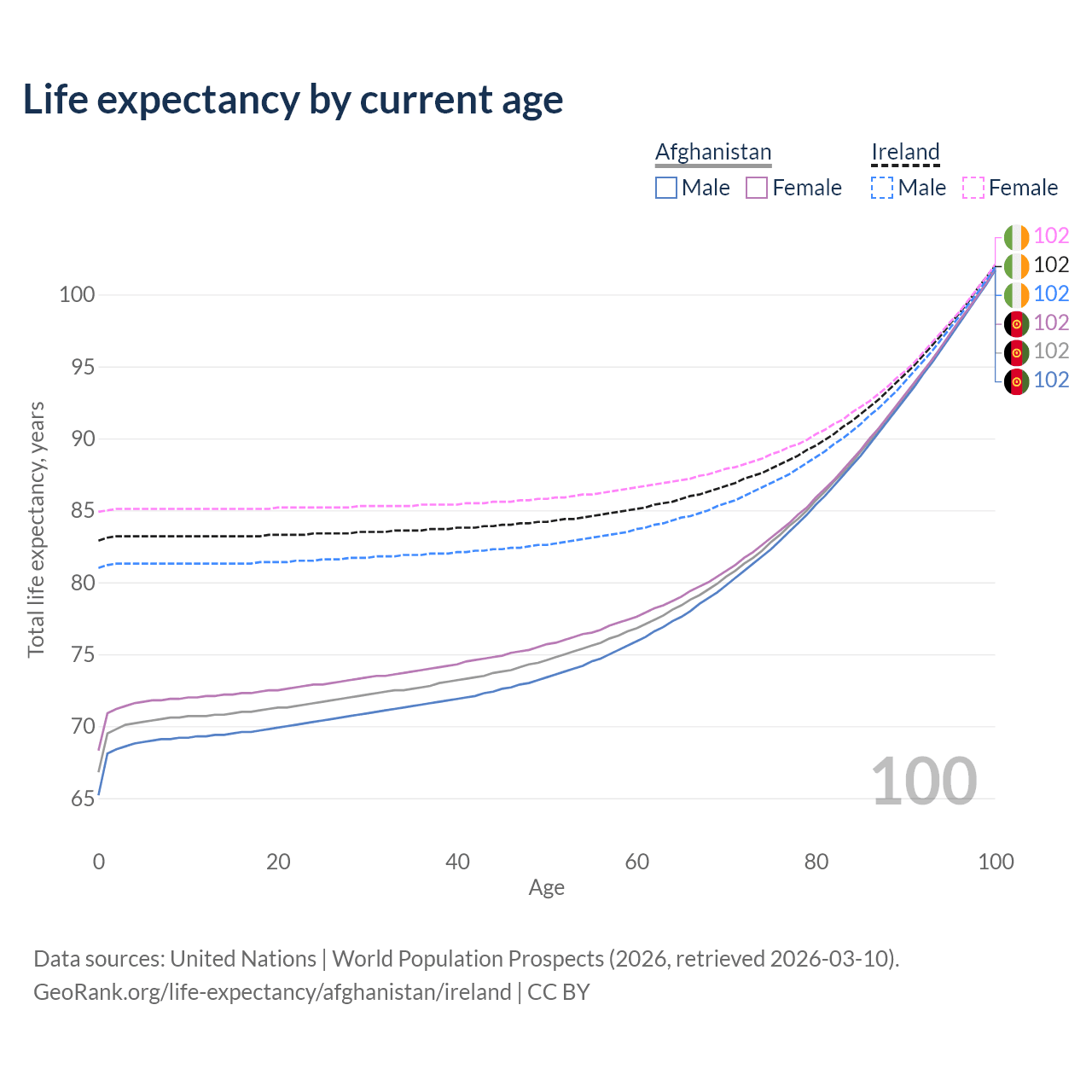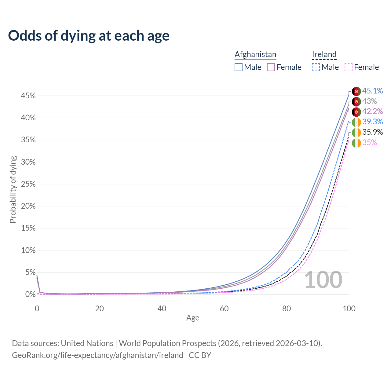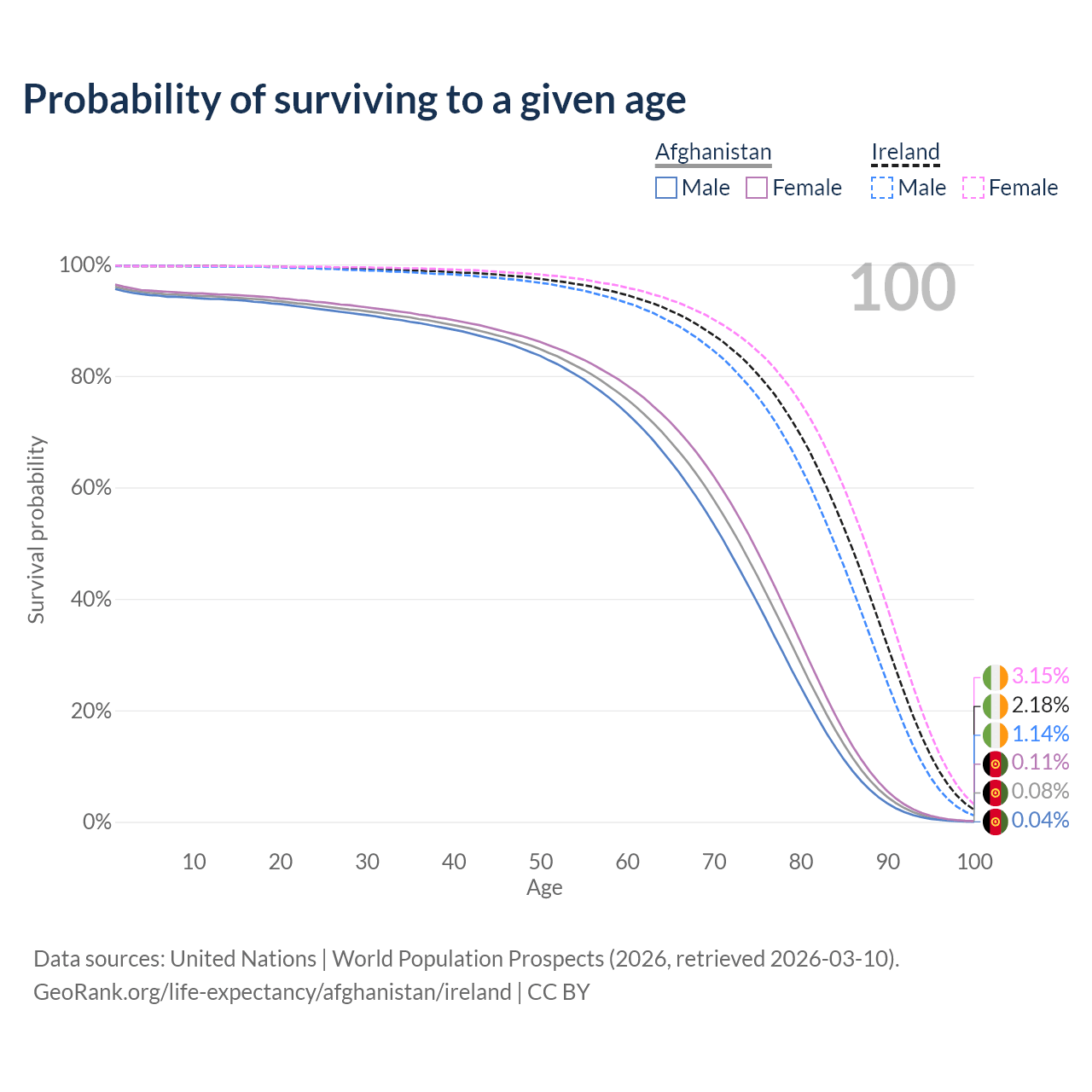 This life expectancy calculator shows the odds of living to 100, 95, 90, and below based on current age for both males and females in Afghanistan and Ireland, along with mean and median age of death. The calculations are based on the 2026 life tables (actuarial tables) from the UN World Population Prospects.