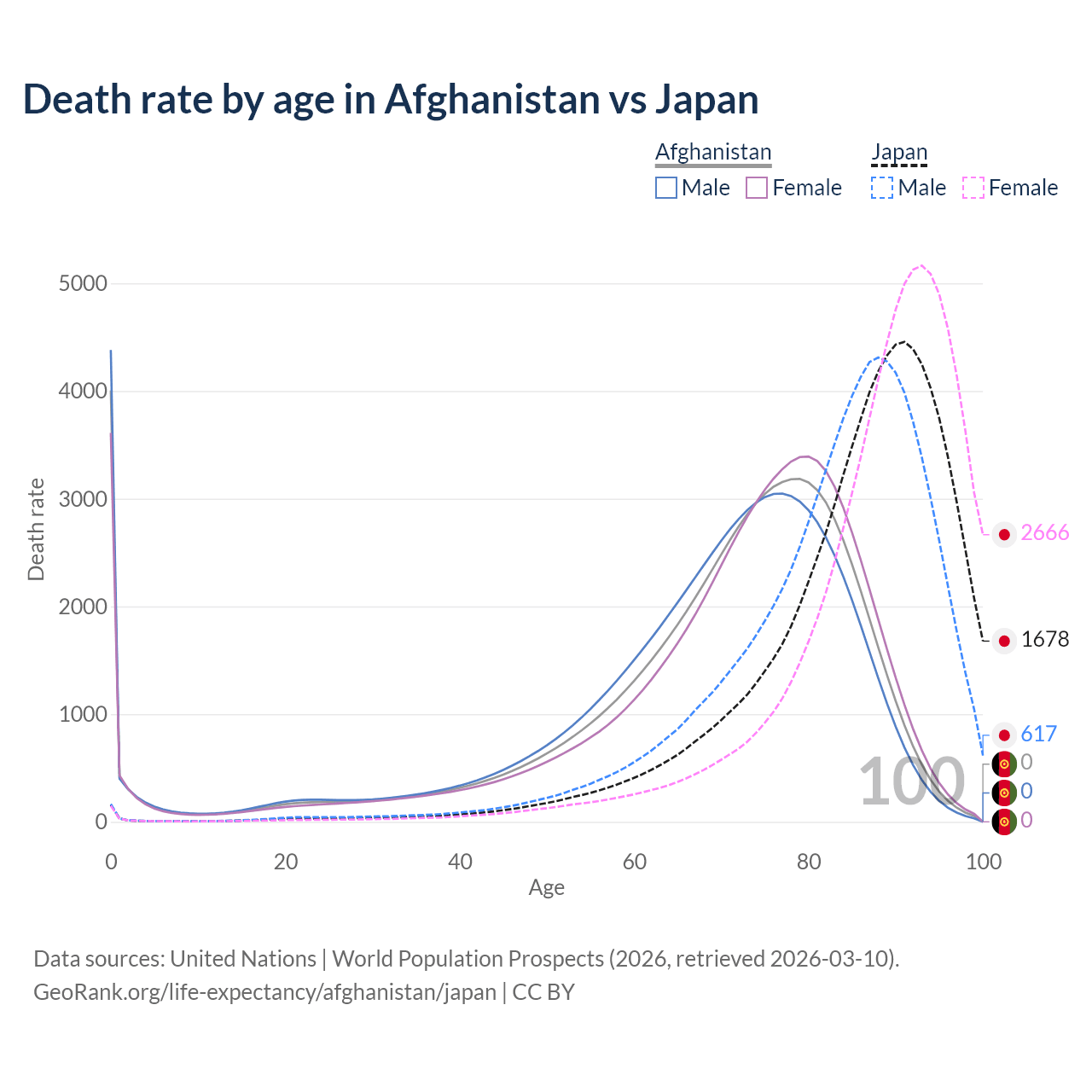 In Afghanistan, the most common age of death is 0, compared to 91 in Japan. The median age of death is 73 in Afghanistan and 88.1 in Japan, meaning only half of each cohort is expected to live past that age.