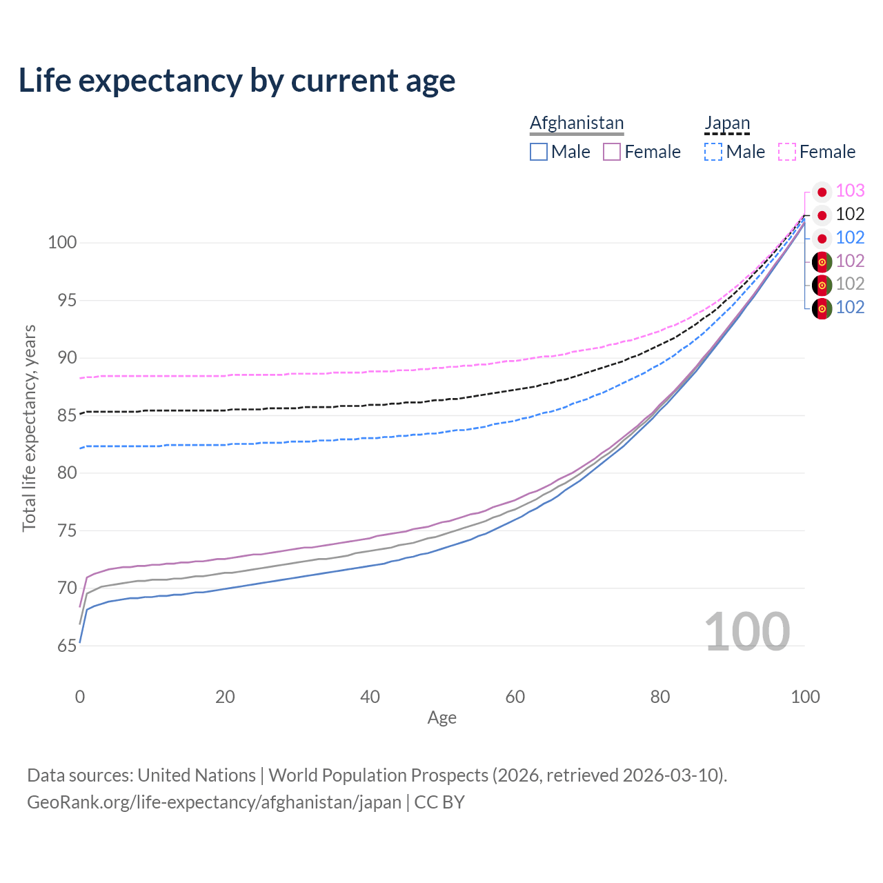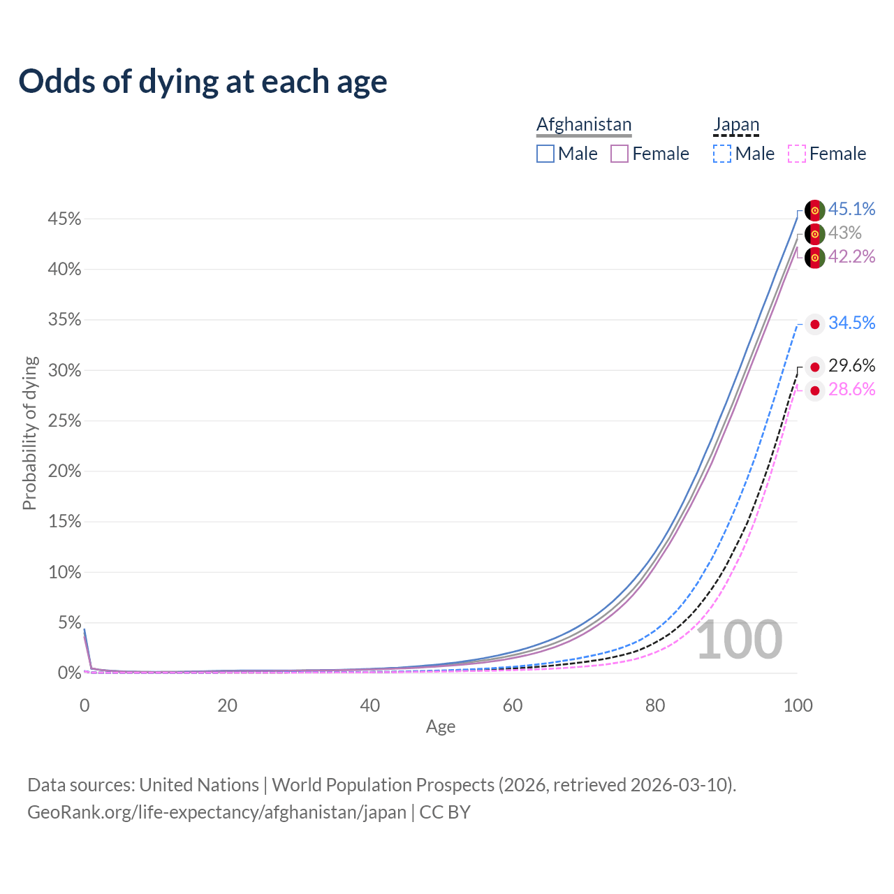 This life expectancy calculator shows the odds of living to 100, 95, 90, and below based on current age for both males and females in Afghanistan and Japan, along with mean and median age of death. The calculations are based on the 2026 life tables (actuarial tables) from the UN World Population Prospects.