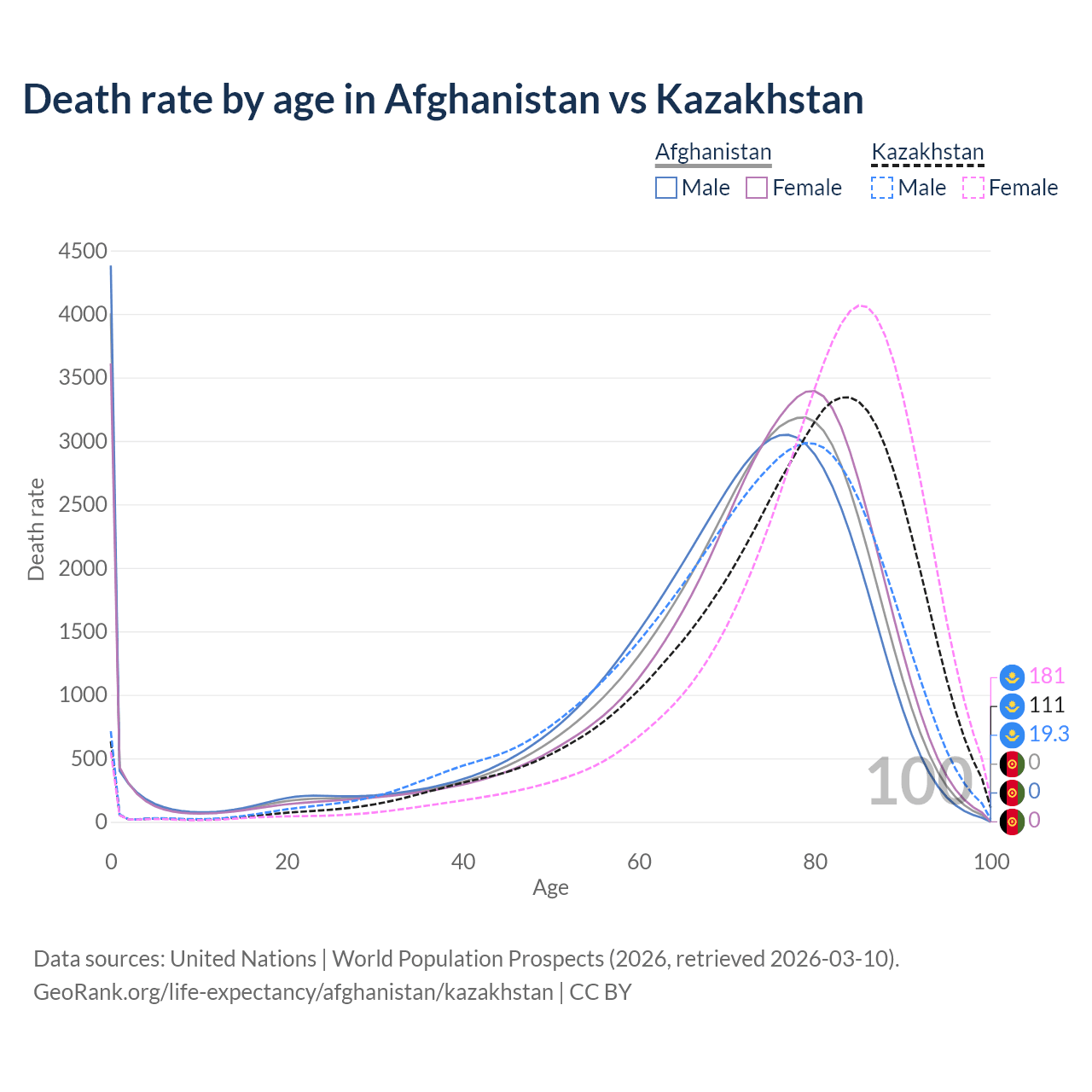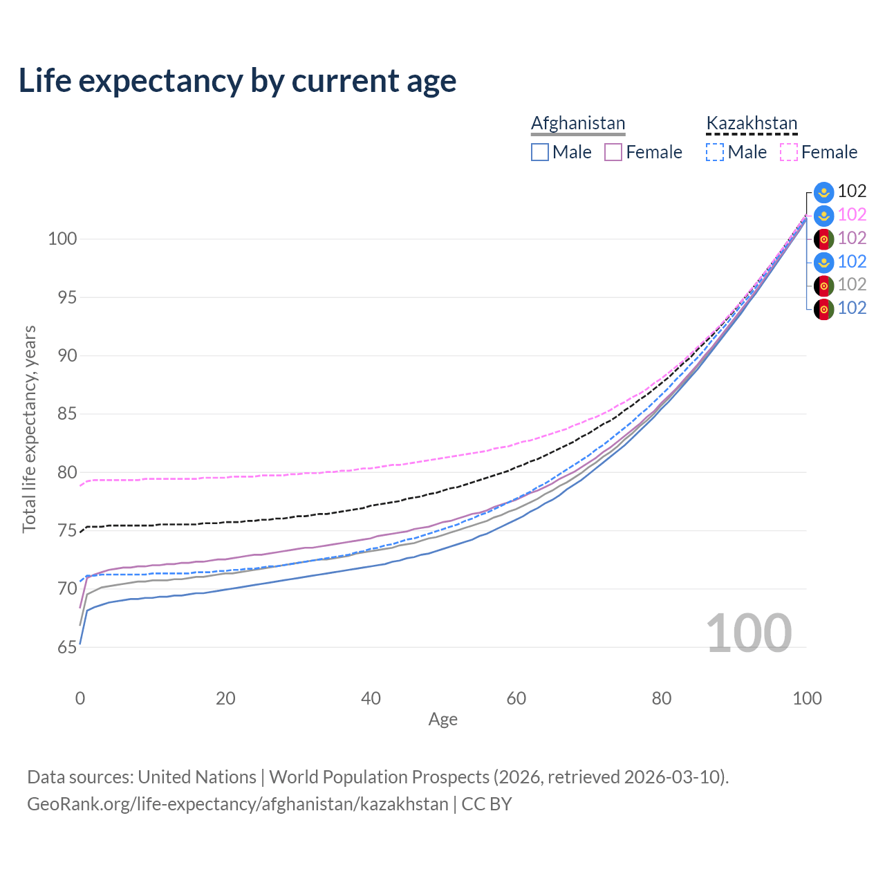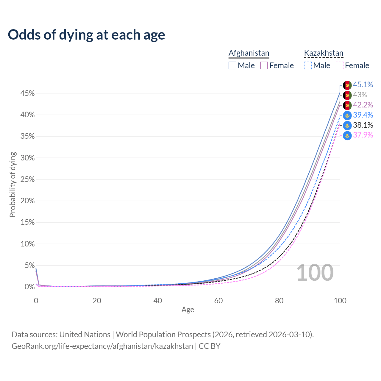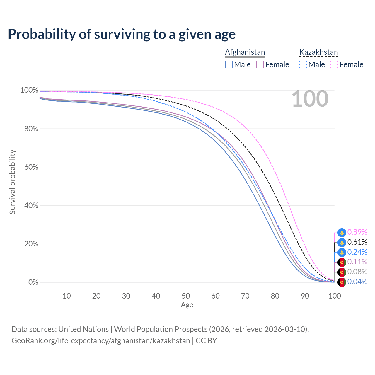This life expectancy calculator shows the odds of living to 100, 95, 90, and below based on current age for both males and females in Afghanistan and Kazakhstan, along with mean and median age of death. The calculations are based on the 2026 life tables (actuarial tables) from the UN World Population Prospects.