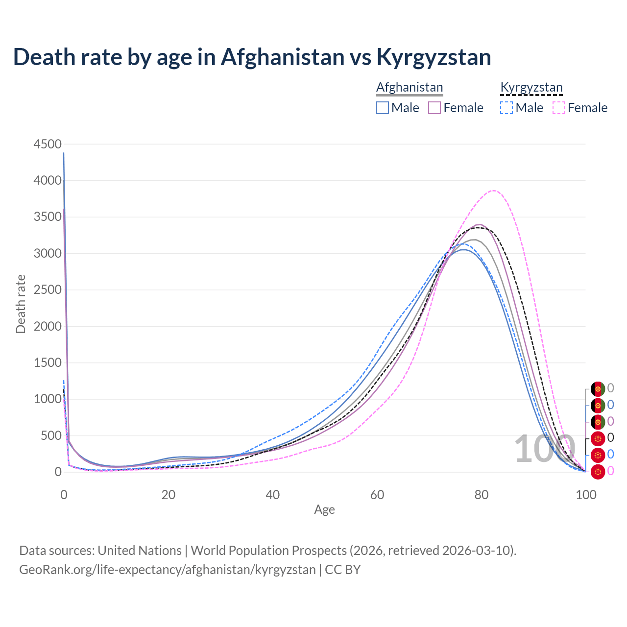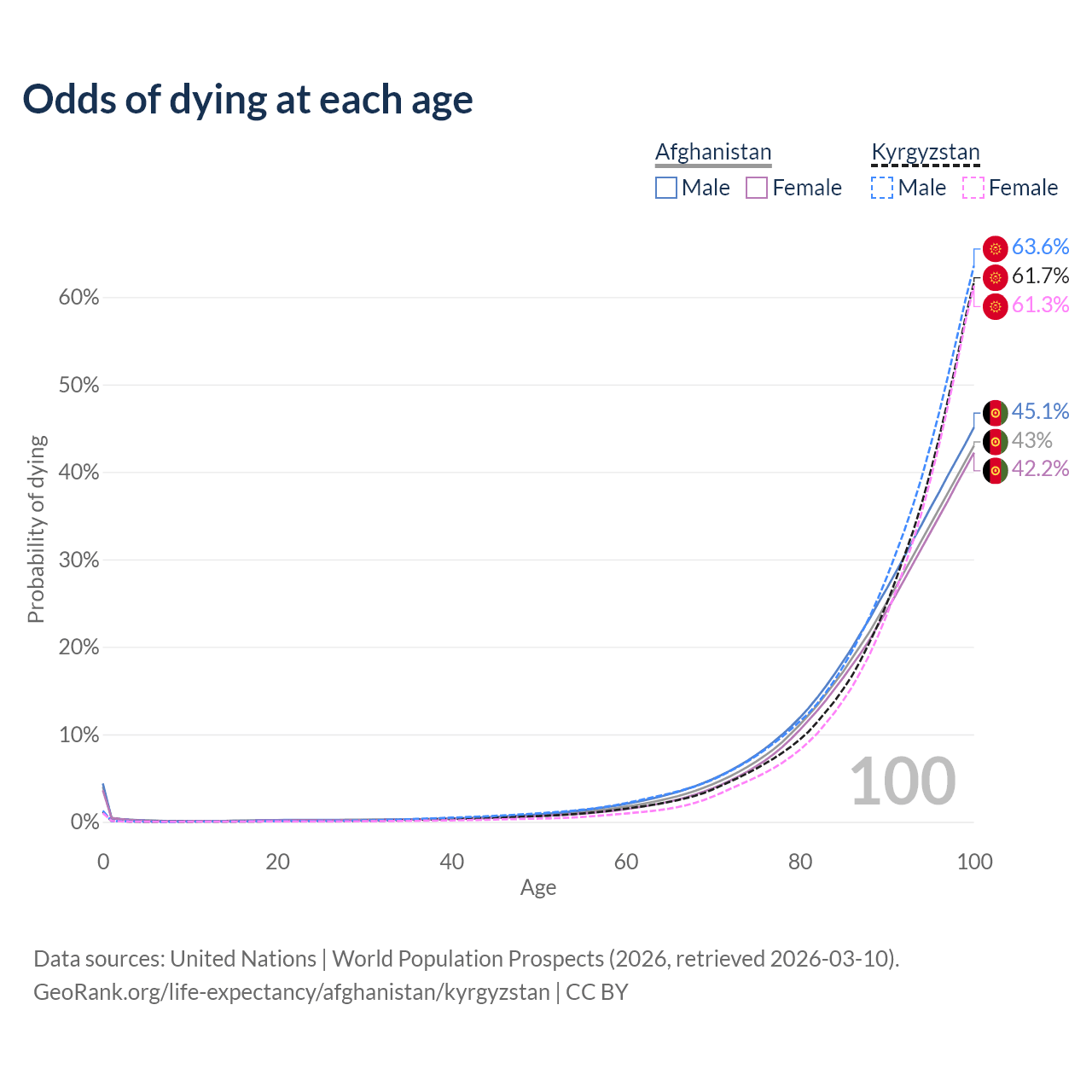 This life expectancy calculator shows the odds of living to 100, 95, 90, and below based on current age for both males and females in Afghanistan and Kyrgyzstan, along with mean and median age of death. The calculations are based on the 2026 life tables (actuarial tables) from the UN World Population Prospects.