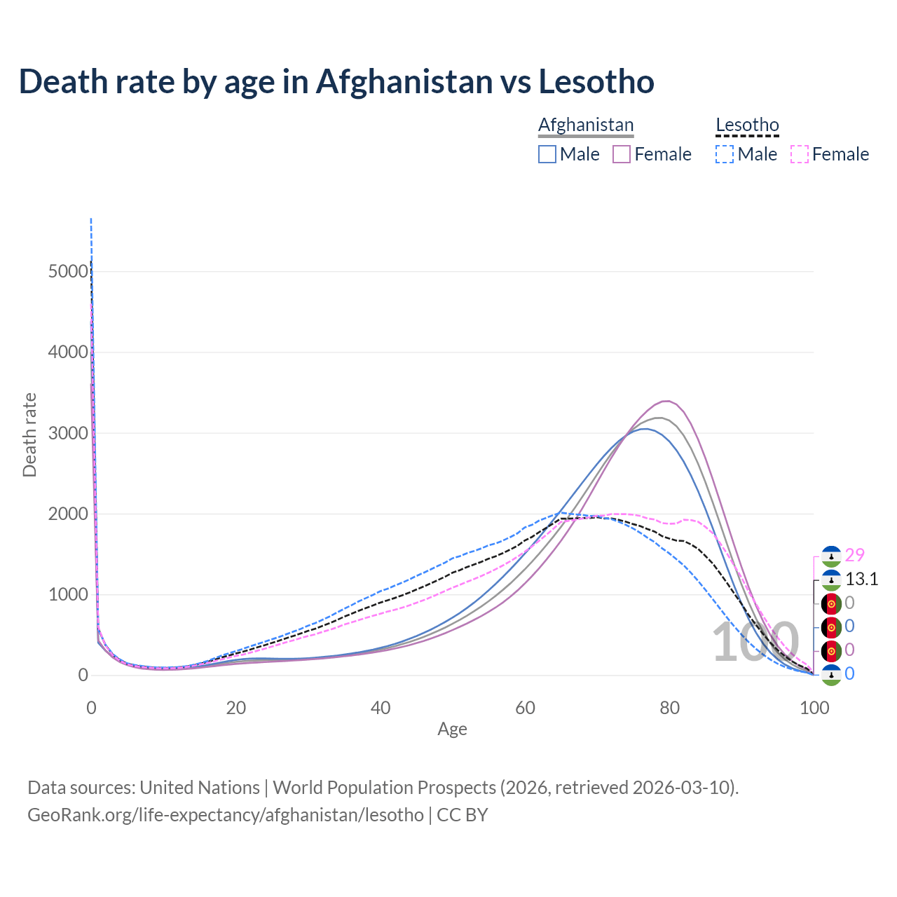 In Afghanistan, the most common age of death is 0, compared to 0 in Lesotho. The median age of death is 73 in Afghanistan and 63.4 in Lesotho, meaning only half of each cohort is expected to live past that age.