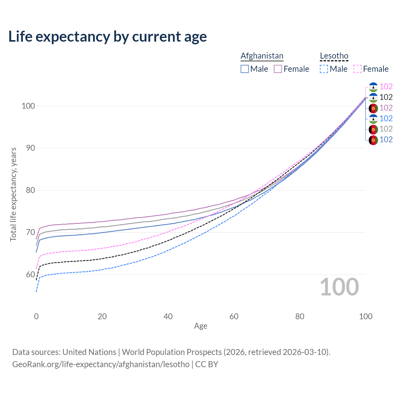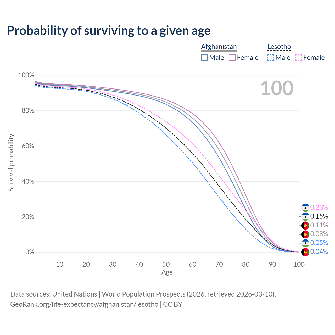This life expectancy calculator shows the odds of living to 100, 95, 90, and below based on current age for both males and females in Afghanistan and Lesotho, along with mean and median age of death. The calculations are based on the 2026 life tables (actuarial tables) from the UN World Population Prospects.
