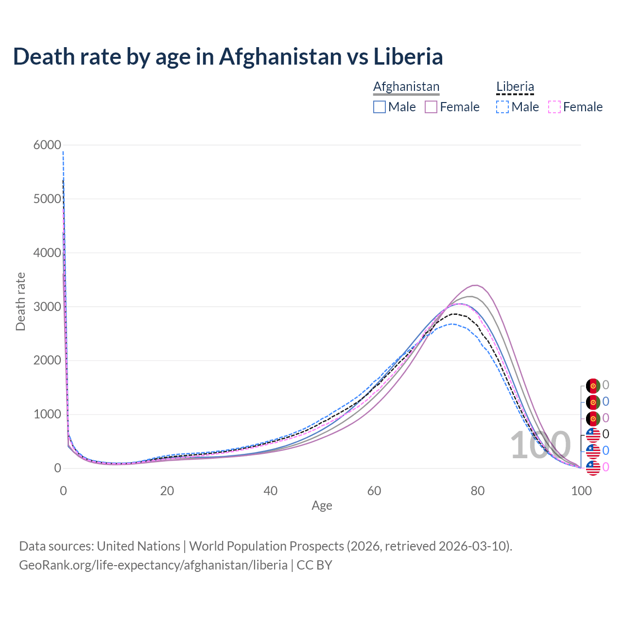 In Afghanistan, the most common age of death is 0, compared to 0 in Liberia. The median age of death is 73 in Afghanistan and 69.6 in Liberia, meaning only half of each cohort is expected to live past that age.