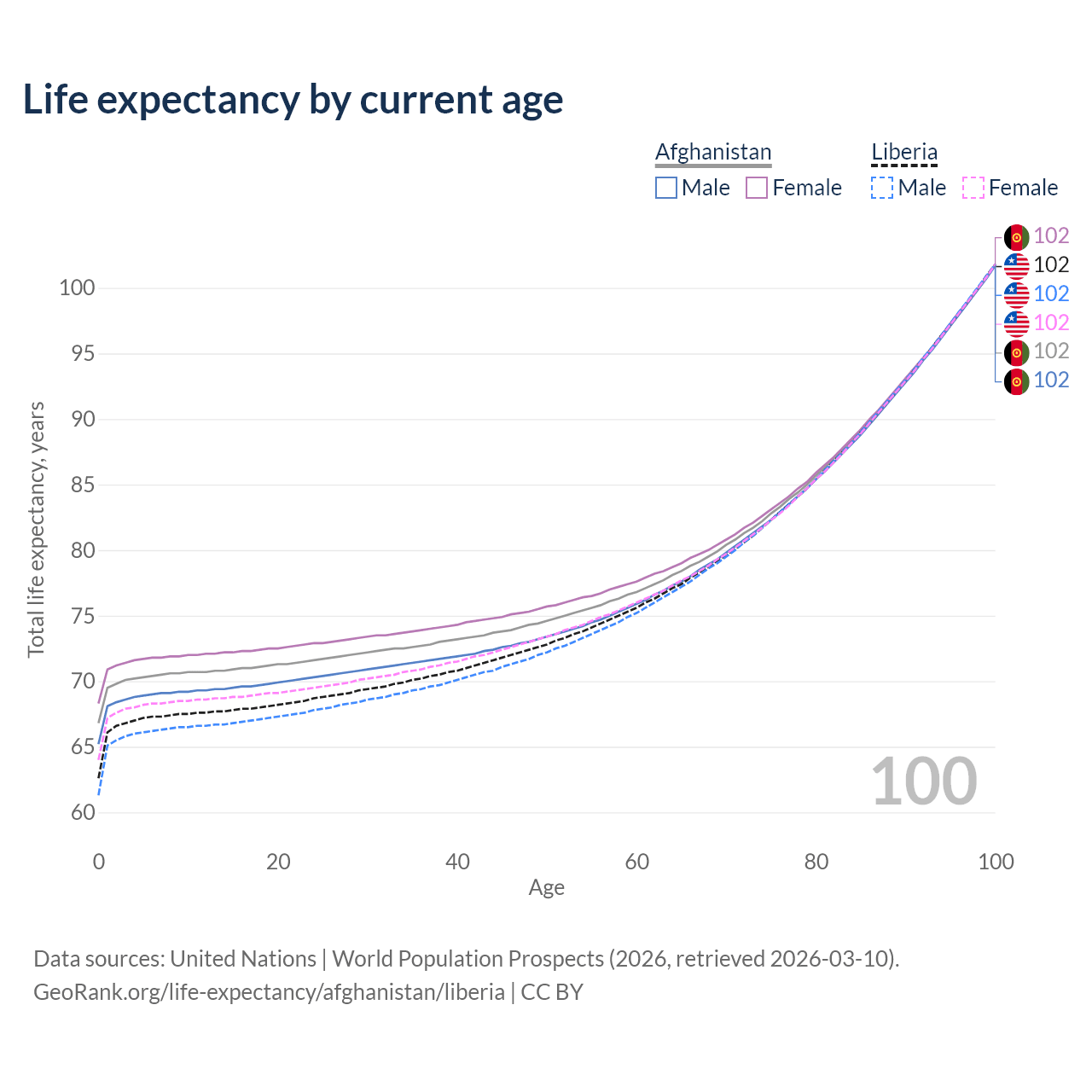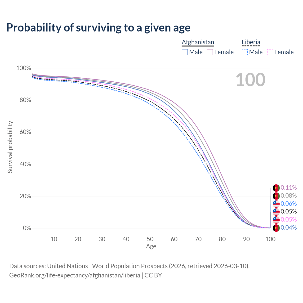 This life expectancy calculator shows the odds of living to 100, 95, 90, and below based on current age for both males and females in Afghanistan and Liberia, along with mean and median age of death. The calculations are based on the 2026 life tables (actuarial tables) from the UN World Population Prospects.