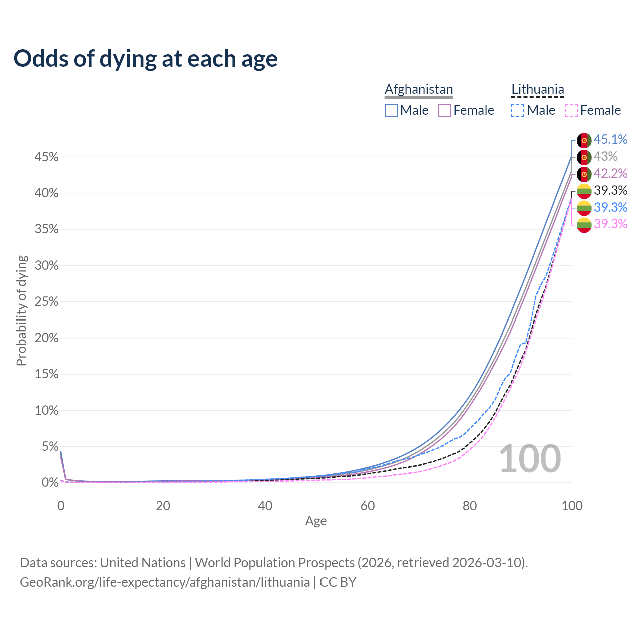 This life expectancy calculator shows the odds of living to 100, 95, 90, and below based on current age for both males and females in Afghanistan and Lithuania, along with mean and median age of death. The calculations are based on the 2026 life tables (actuarial tables) from the UN World Population Prospects.