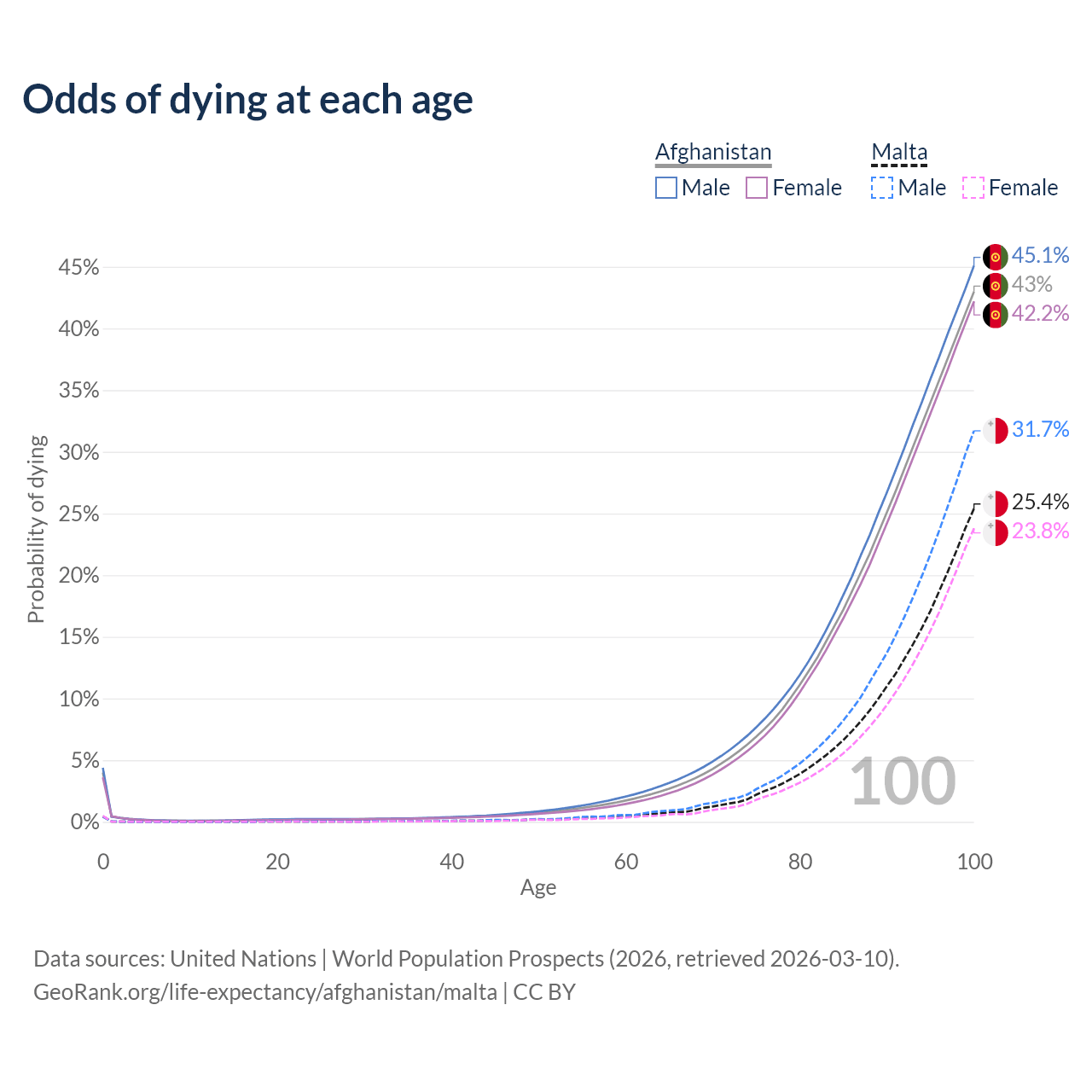 This life expectancy calculator shows the odds of living to 100, 95, 90, and below based on current age for both males and females in Afghanistan and Malta, along with mean and median age of death. The calculations are based on the 2026 life tables (actuarial tables) from the UN World Population Prospects.