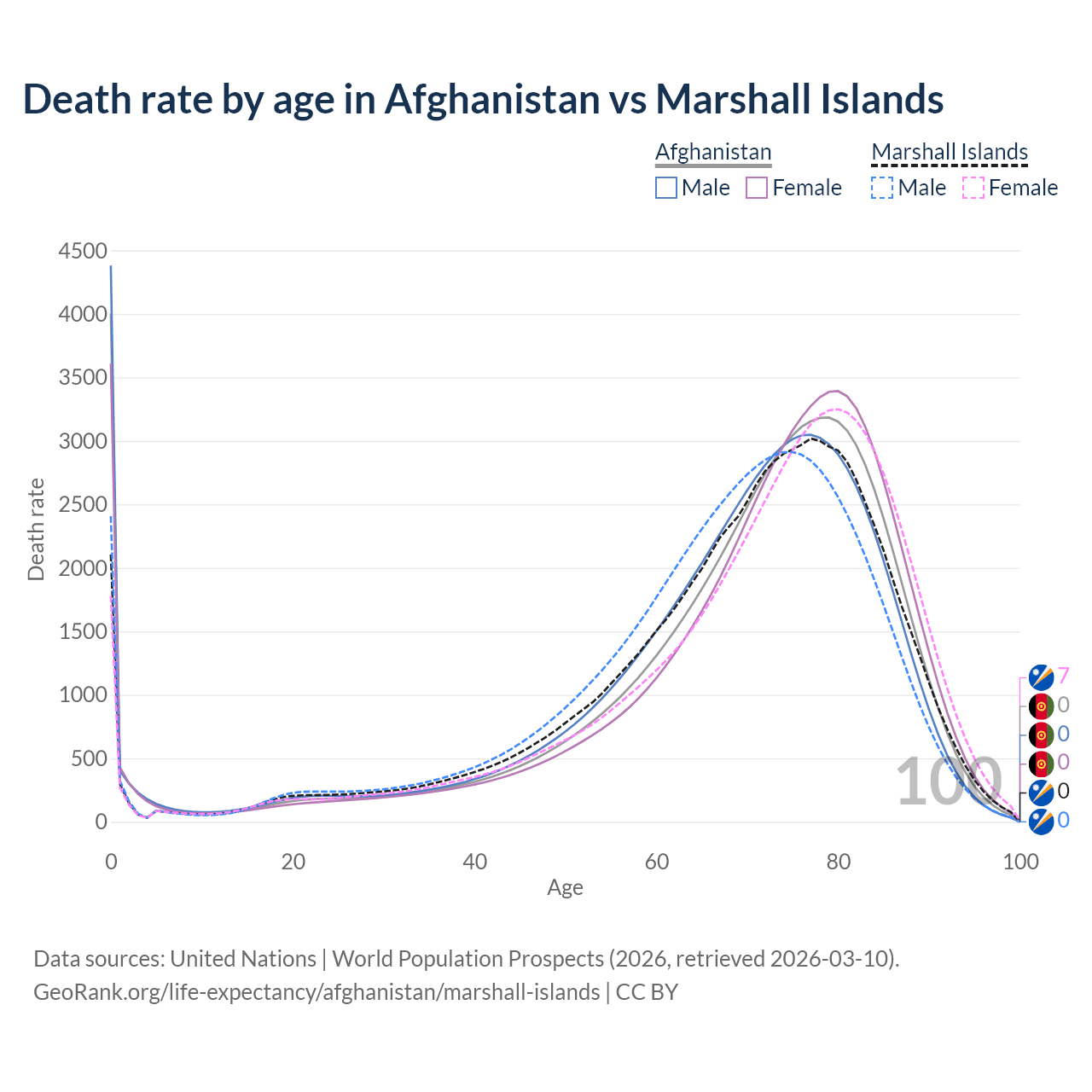 In Afghanistan, the most common age of death is 0, compared to 77 in the Marshall Islands. The median age of death is 73 in Afghanistan and 72 in the Marshall Islands, meaning only half of each cohort is expected to live past that age.