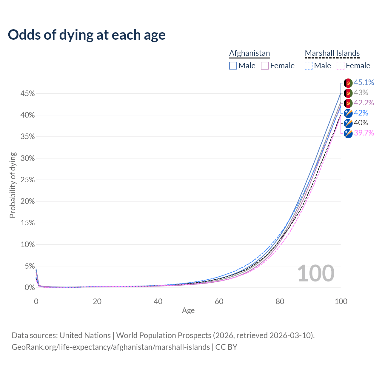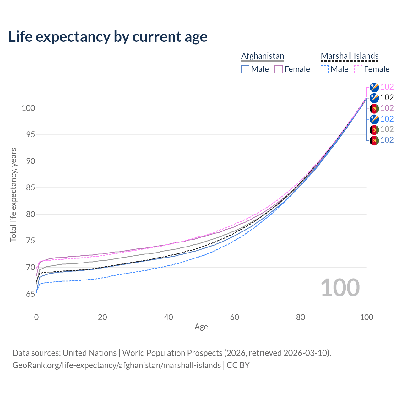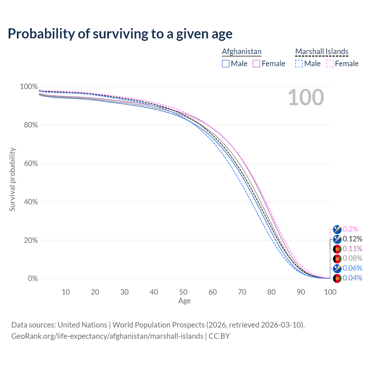 This life expectancy calculator shows the odds of living to 100, 95, 90, and below based on current age for both males and females in Afghanistan and the Marshall Islands, along with mean and median age of death. The calculations are based on the 2026 life tables (actuarial tables) from the UN World Population Prospects.