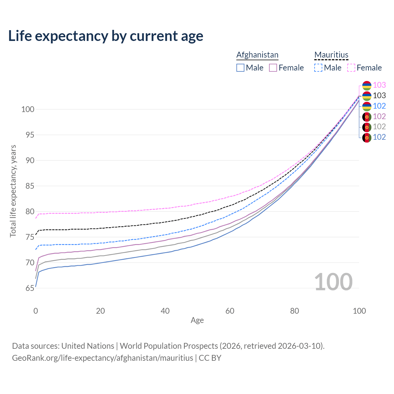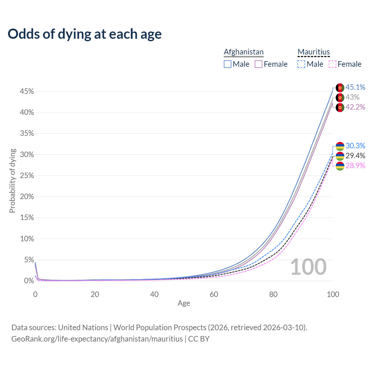 This life expectancy calculator shows the odds of living to 100, 95, 90, and below based on current age for both males and females in Afghanistan and Mauritius, along with mean and median age of death. The calculations are based on the 2026 life tables (actuarial tables) from the UN World Population Prospects.