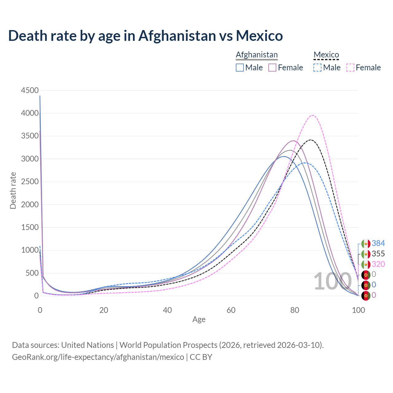 In Afghanistan, the most common age of death is 0, compared to 85 in Mexico. The median age of death is 73 in Afghanistan and 80.1 in Mexico, meaning only half of each cohort is expected to live past that age.