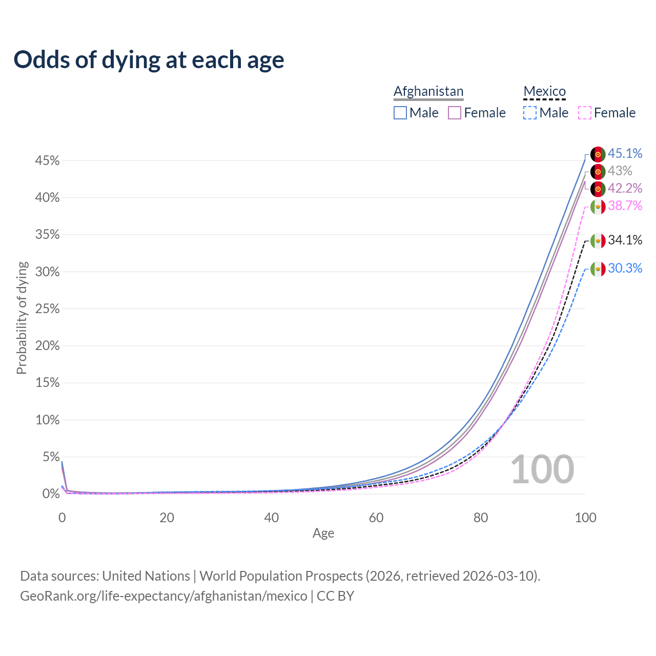 This life expectancy calculator shows the odds of living to 100, 95, 90, and below based on current age for both males and females in Afghanistan and Mexico, along with mean and median age of death. The calculations are based on the 2026 life tables (actuarial tables) from the UN World Population Prospects.