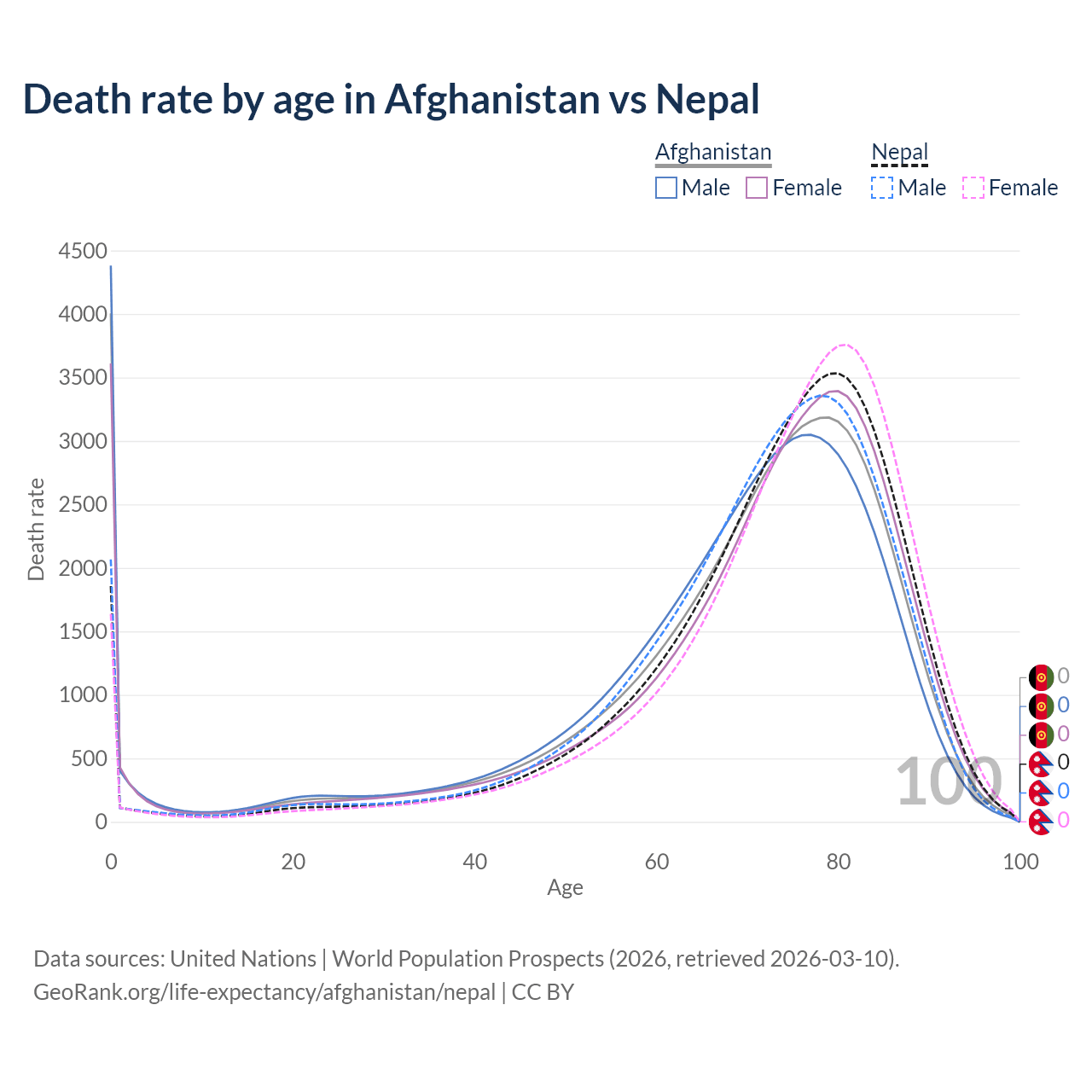 In Afghanistan, the most common age of death is 0, compared to 80 in Nepal. The median age of death is 73 in Afghanistan and 75.4 in Nepal, meaning only half of each cohort is expected to live past that age.