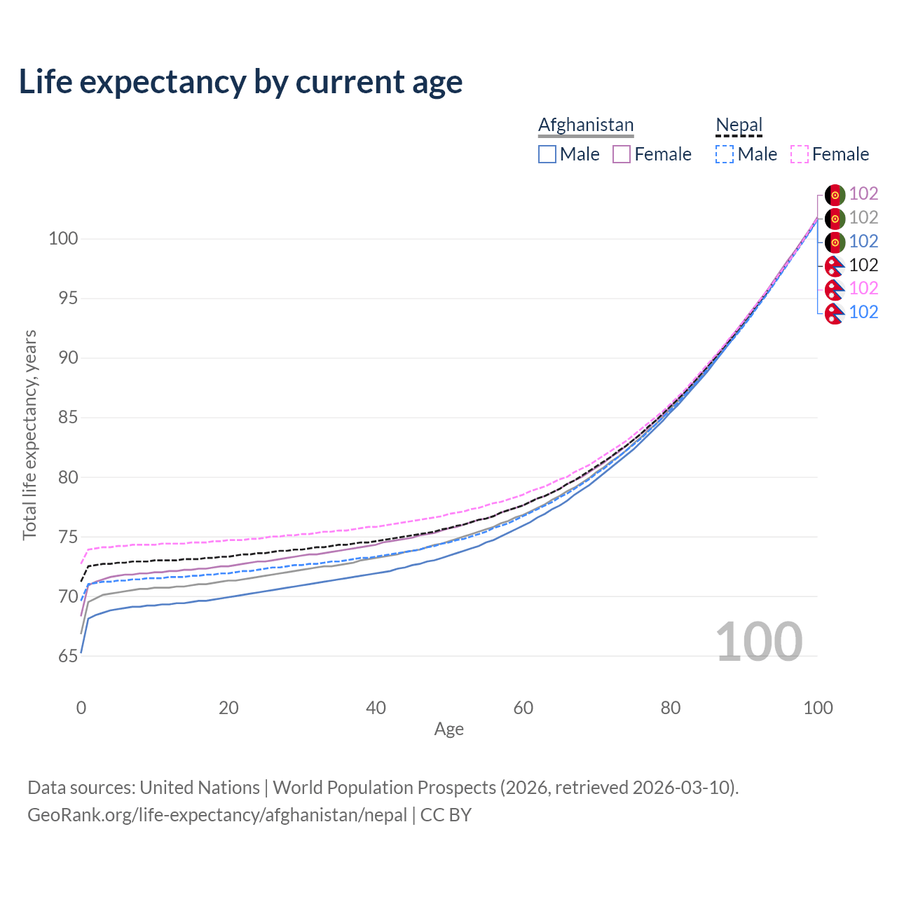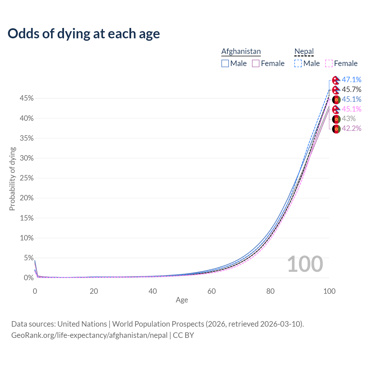 This life expectancy calculator shows the odds of living to 100, 95, 90, and below based on current age for both males and females in Afghanistan and Nepal, along with mean and median age of death. The calculations are based on the 2026 life tables (actuarial tables) from the UN World Population Prospects.