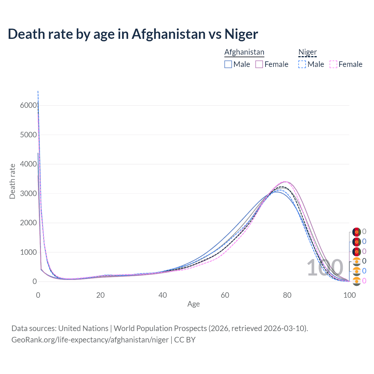 In Afghanistan, the most common age of death is 0, compared to 0 in Niger. The median age of death is 73 in Afghanistan and 71.7 in Niger, meaning only half of each cohort is expected to live past that age.
