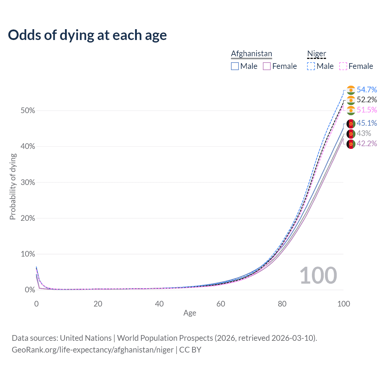 This life expectancy calculator shows the odds of living to 100, 95, 90, and below based on current age for both males and females in Afghanistan and Niger, along with mean and median age of death. The calculations are based on the 2026 life tables (actuarial tables) from the UN World Population Prospects.