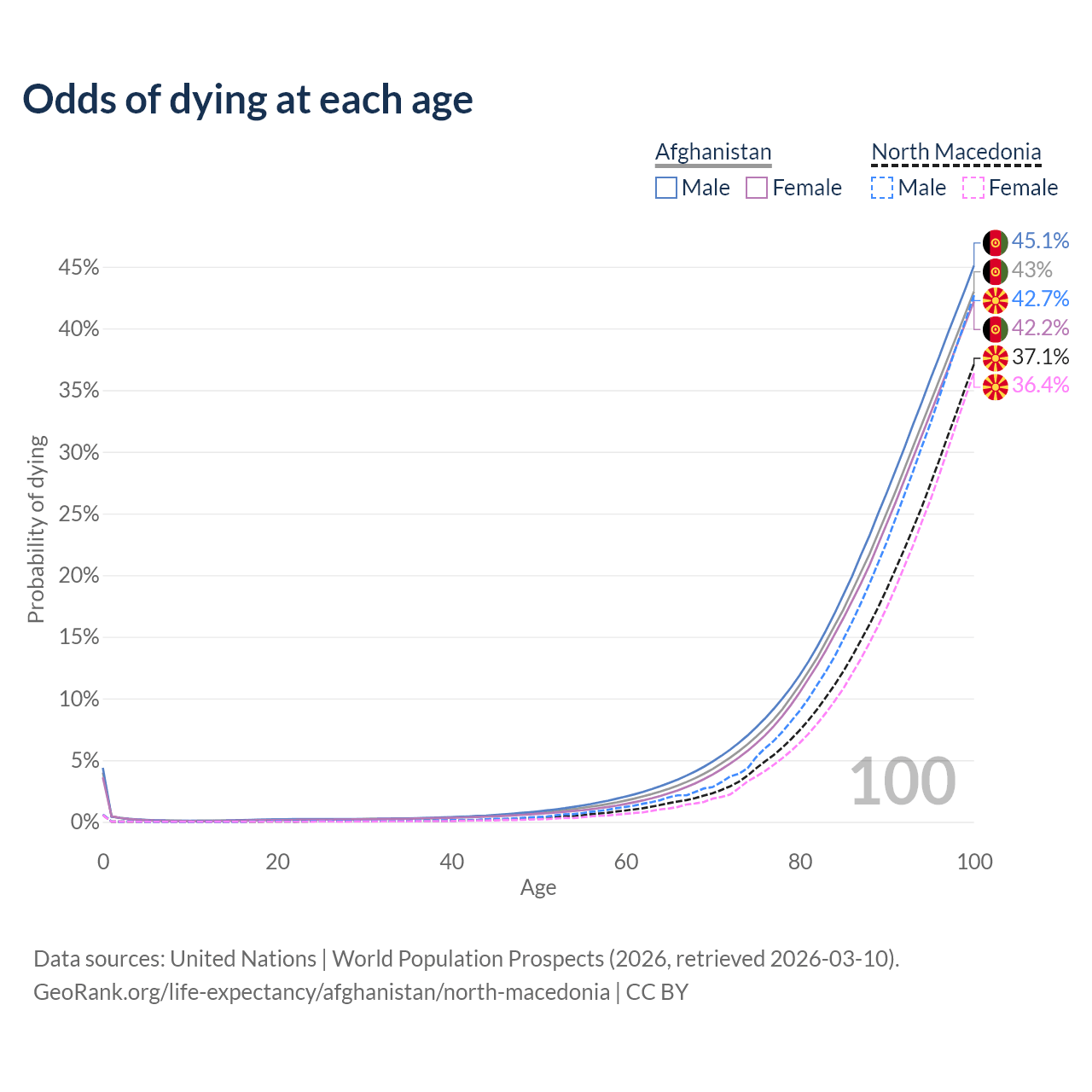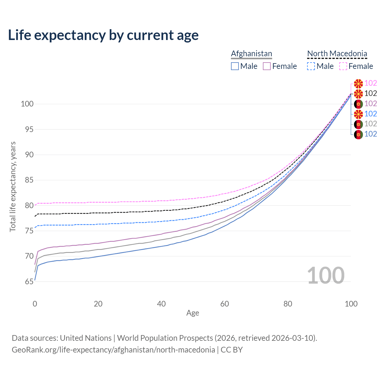 This life expectancy calculator shows the odds of living to 100, 95, 90, and below based on current age for both males and females in Afghanistan and North Macedonia, along with mean and median age of death. The calculations are based on the 2026 life tables (actuarial tables) from the UN World Population Prospects.