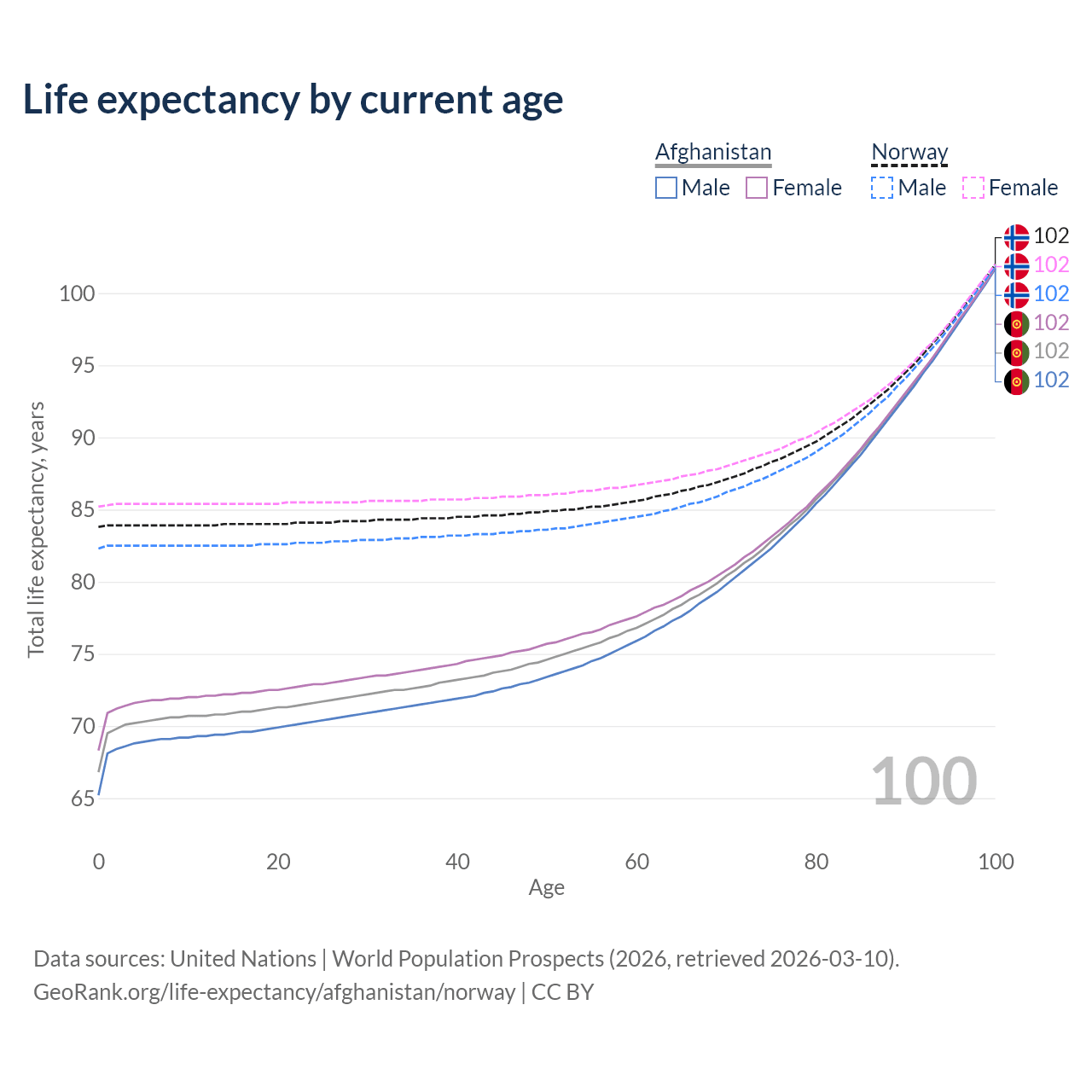 This life expectancy calculator shows the odds of living to 100, 95, 90, and below based on current age for both males and females in Afghanistan and Norway, along with mean and median age of death. The calculations are based on the 2026 life tables (actuarial tables) from the UN World Population Prospects.