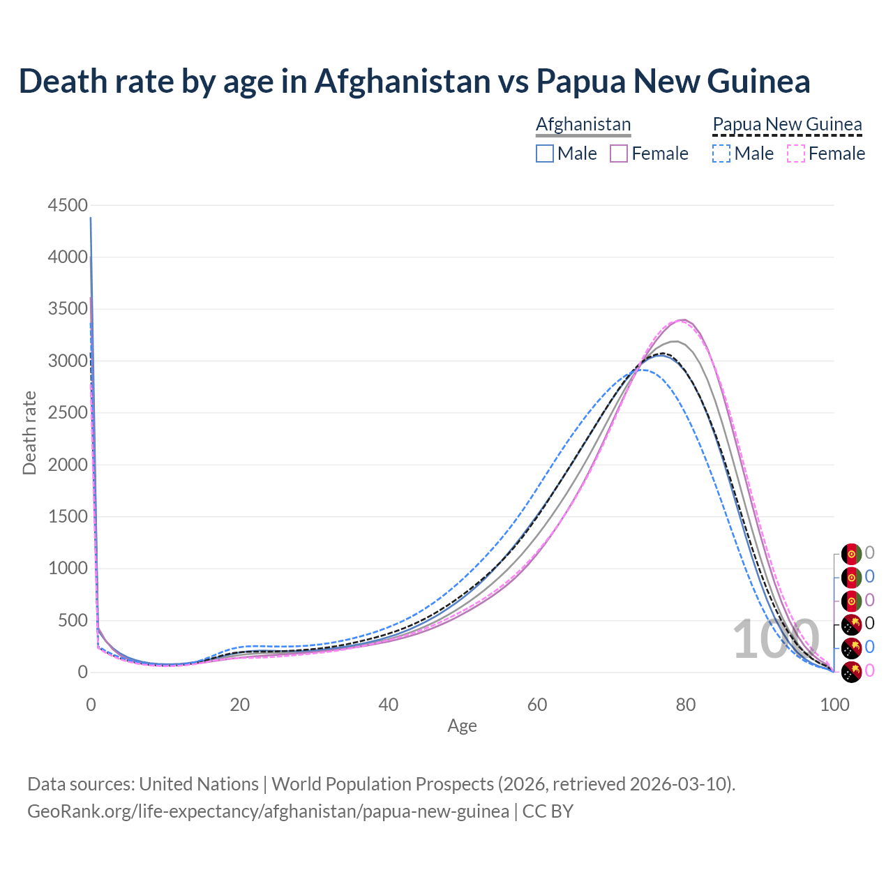 In Afghanistan, the most common age of death is 0, compared to 0 in Papua New Guinea. The median age of death is 73 in Afghanistan and 71.7 in Papua New Guinea, meaning only half of each cohort is expected to live past that age.