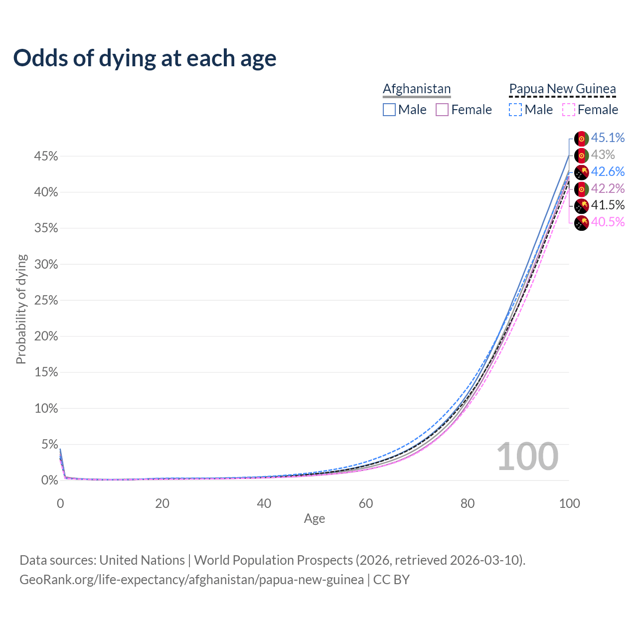 This life expectancy calculator shows the odds of living to 100, 95, 90, and below based on current age for both males and females in Afghanistan and Papua New Guinea, along with mean and median age of death. The calculations are based on the 2026 life tables (actuarial tables) from the UN World Population Prospects.