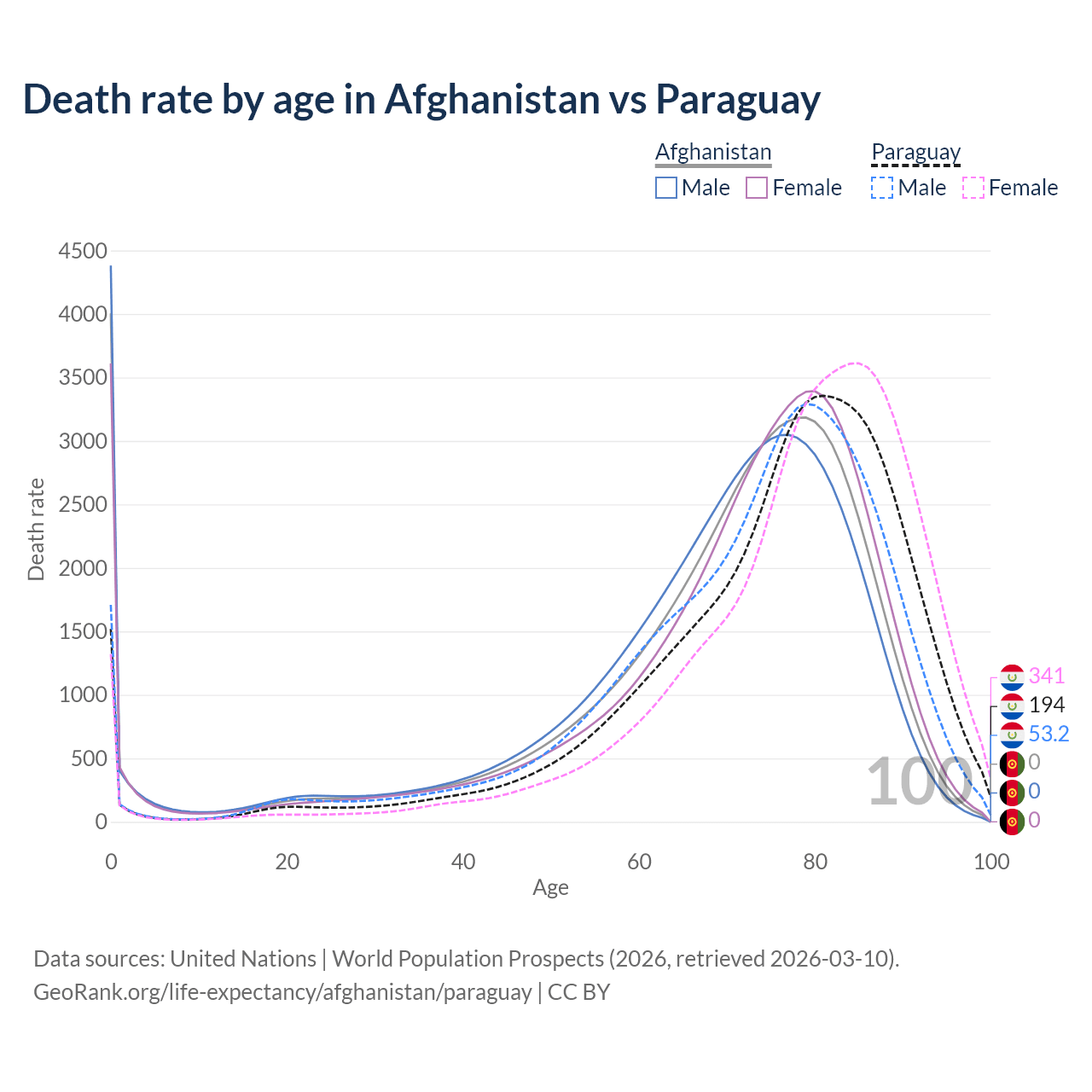 In Afghanistan, the most common age of death is 0, compared to 81 in Paraguay. The median age of death is 73 in Afghanistan and 78.4 in Paraguay, meaning only half of each cohort is expected to live past that age.