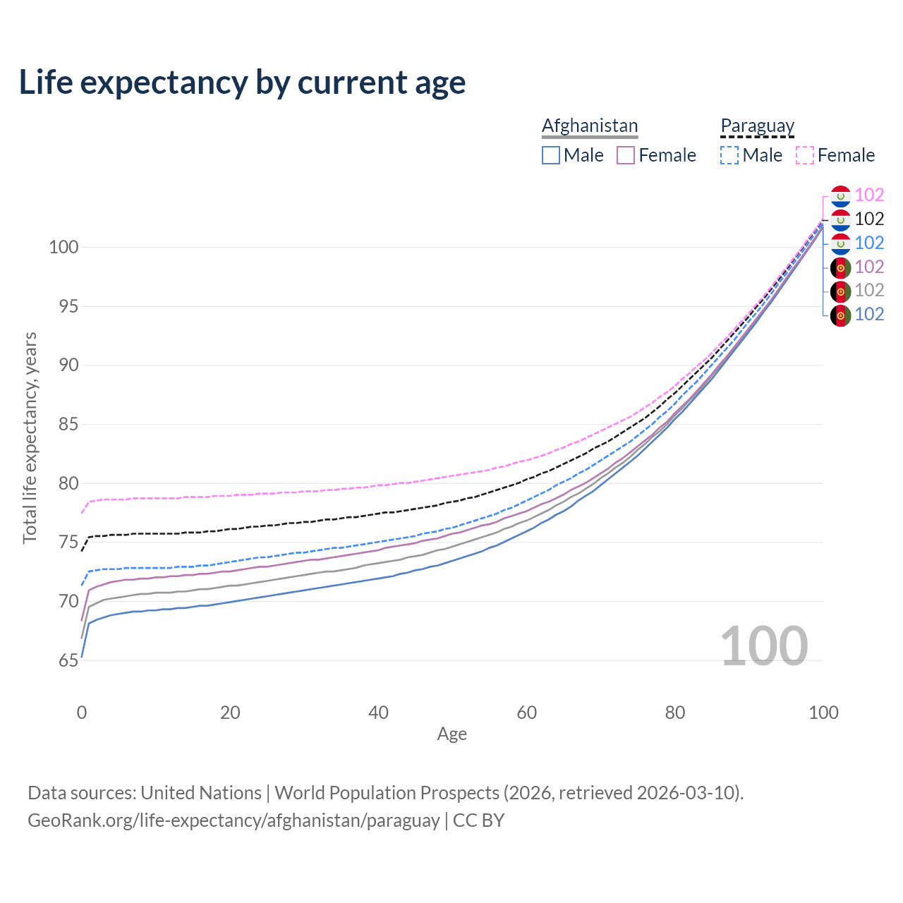 This life expectancy calculator shows the odds of living to 100, 95, 90, and below based on current age for both males and females in Afghanistan and Paraguay, along with mean and median age of death. The calculations are based on the 2026 life tables (actuarial tables) from the UN World Population Prospects.
