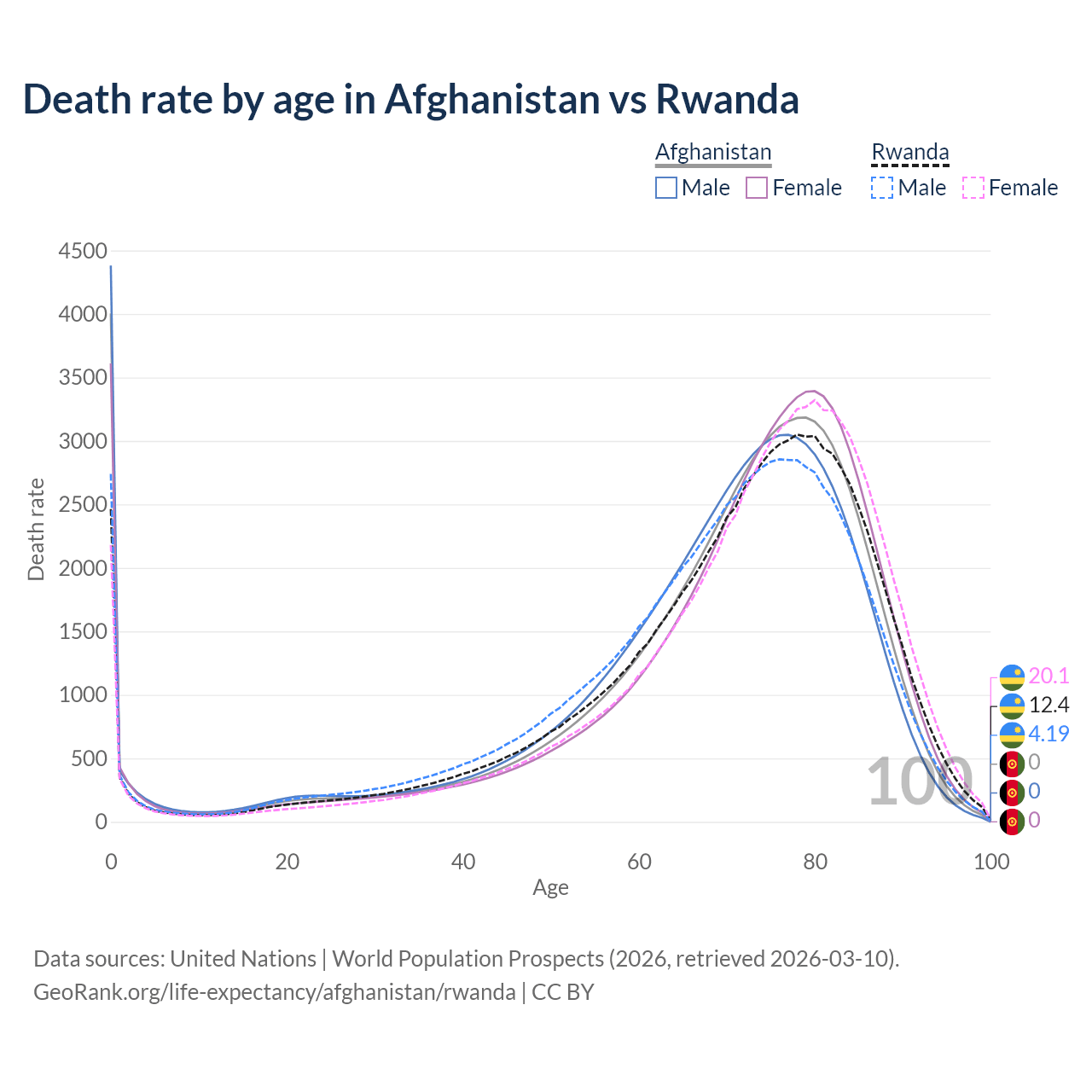 In Afghanistan, the most common age of death is 0, compared to 78 in Rwanda. The median age of death is 73 in Afghanistan and 73.5 in Rwanda, meaning only half of each cohort is expected to live past that age.