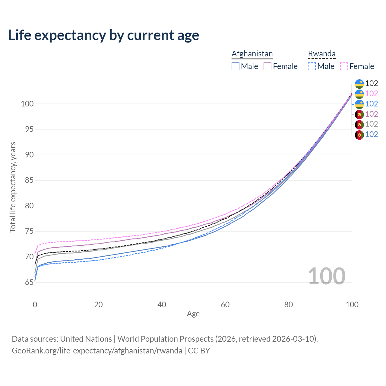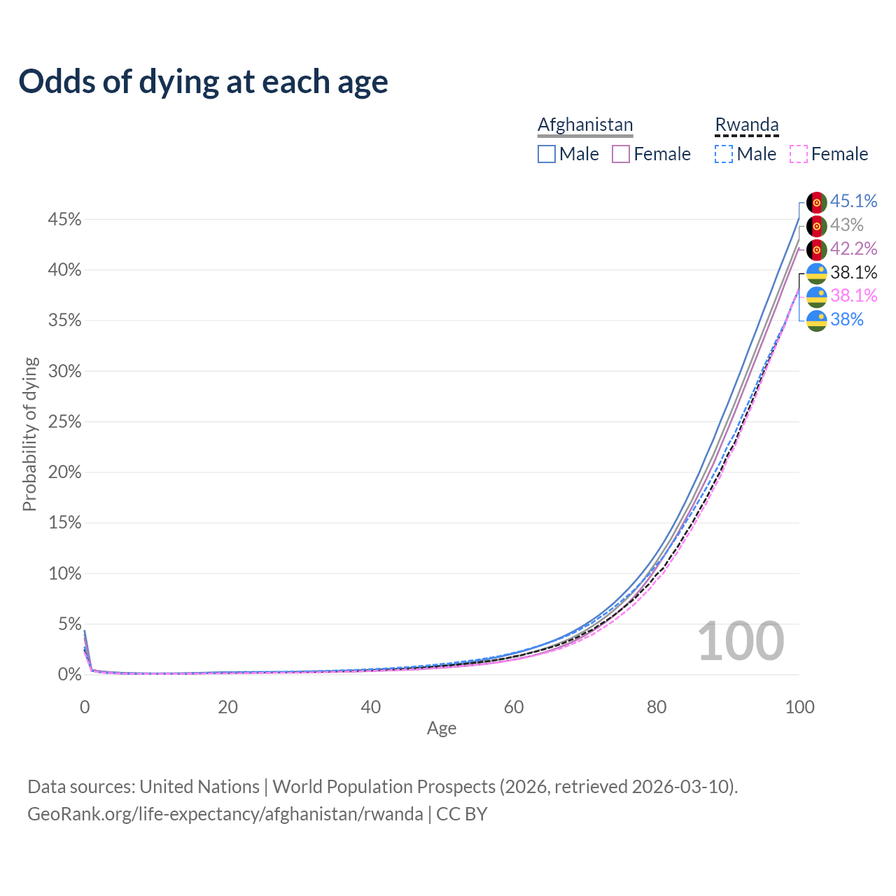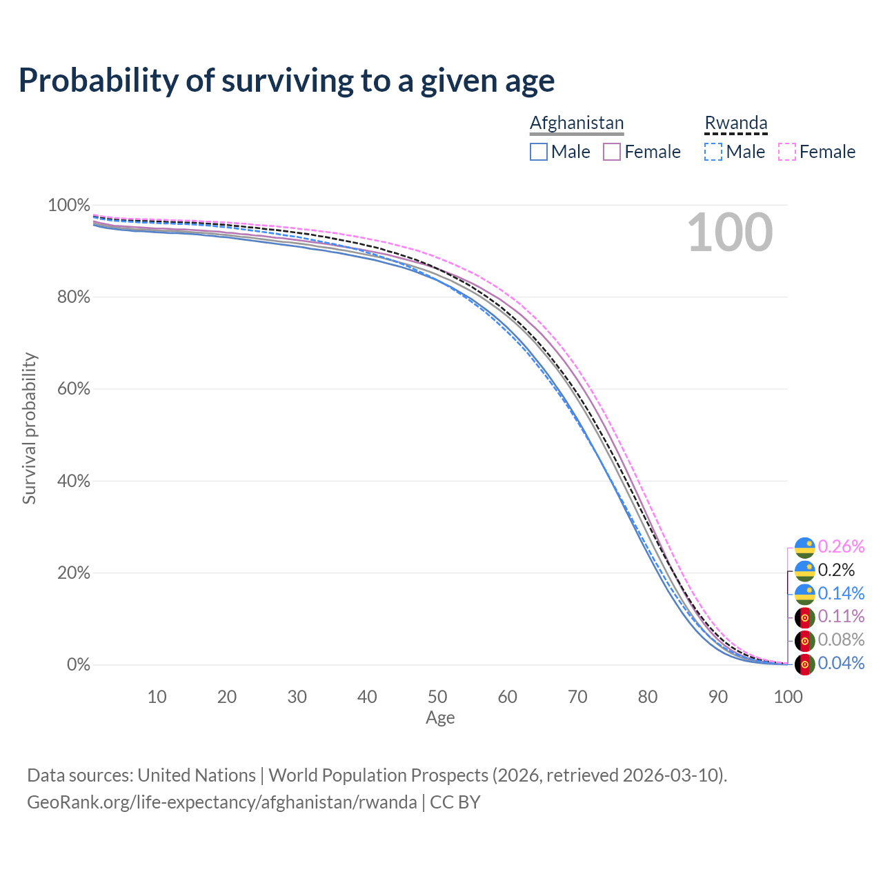 This life expectancy calculator shows the odds of living to 100, 95, 90, and below based on current age for both males and females in Afghanistan and Rwanda, along with mean and median age of death. The calculations are based on the 2026 life tables (actuarial tables) from the UN World Population Prospects.