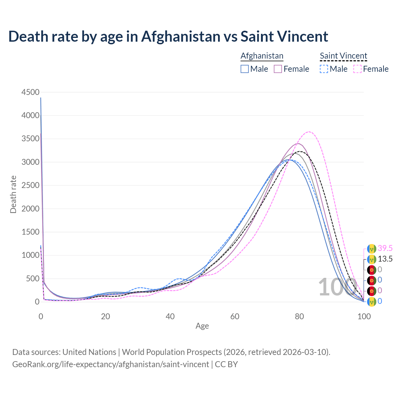 In Afghanistan, the most common age of death is 0, compared to 80 in Saint Vincent. The median age of death is 73 in Afghanistan and 75.6 in Saint Vincent, meaning only half of each cohort is expected to live past that age.