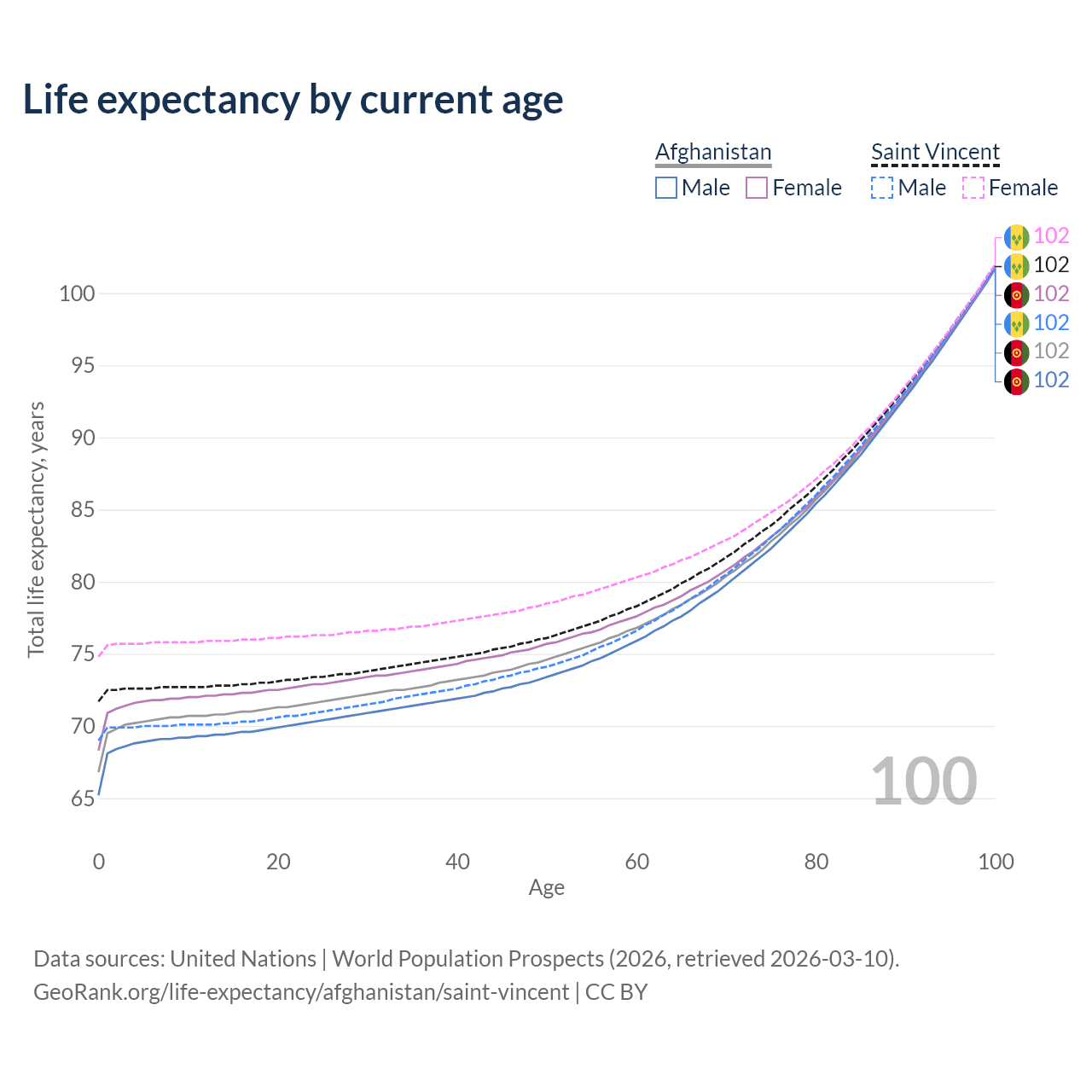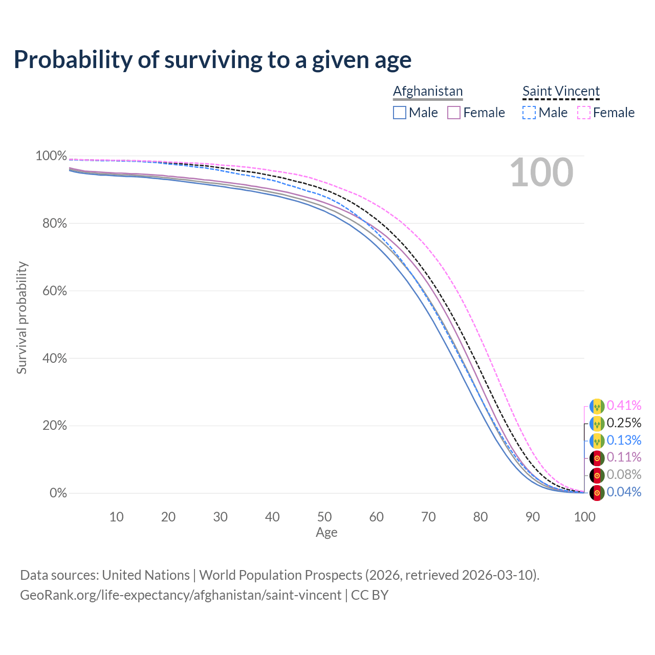 This life expectancy calculator shows the odds of living to 100, 95, 90, and below based on current age for both males and females in Afghanistan and Saint Vincent, along with mean and median age of death. The calculations are based on the 2026 life tables (actuarial tables) from the UN World Population Prospects.