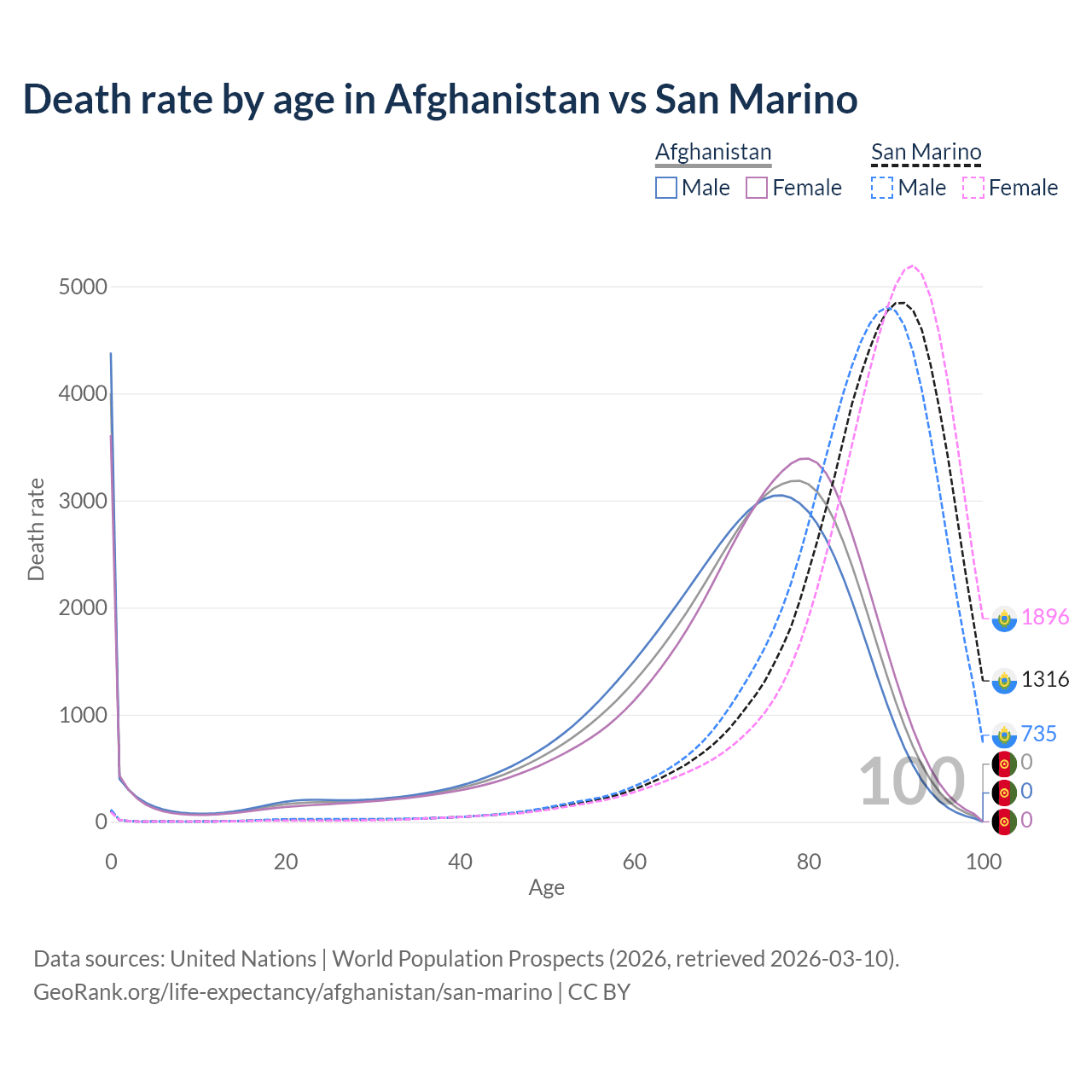 In Afghanistan, the most common age of death is 0, compared to 91 in San Marino. The median age of death is 73 in Afghanistan and 88.3 in San Marino, meaning only half of each cohort is expected to live past that age.