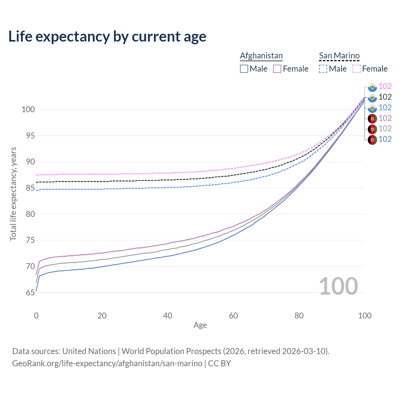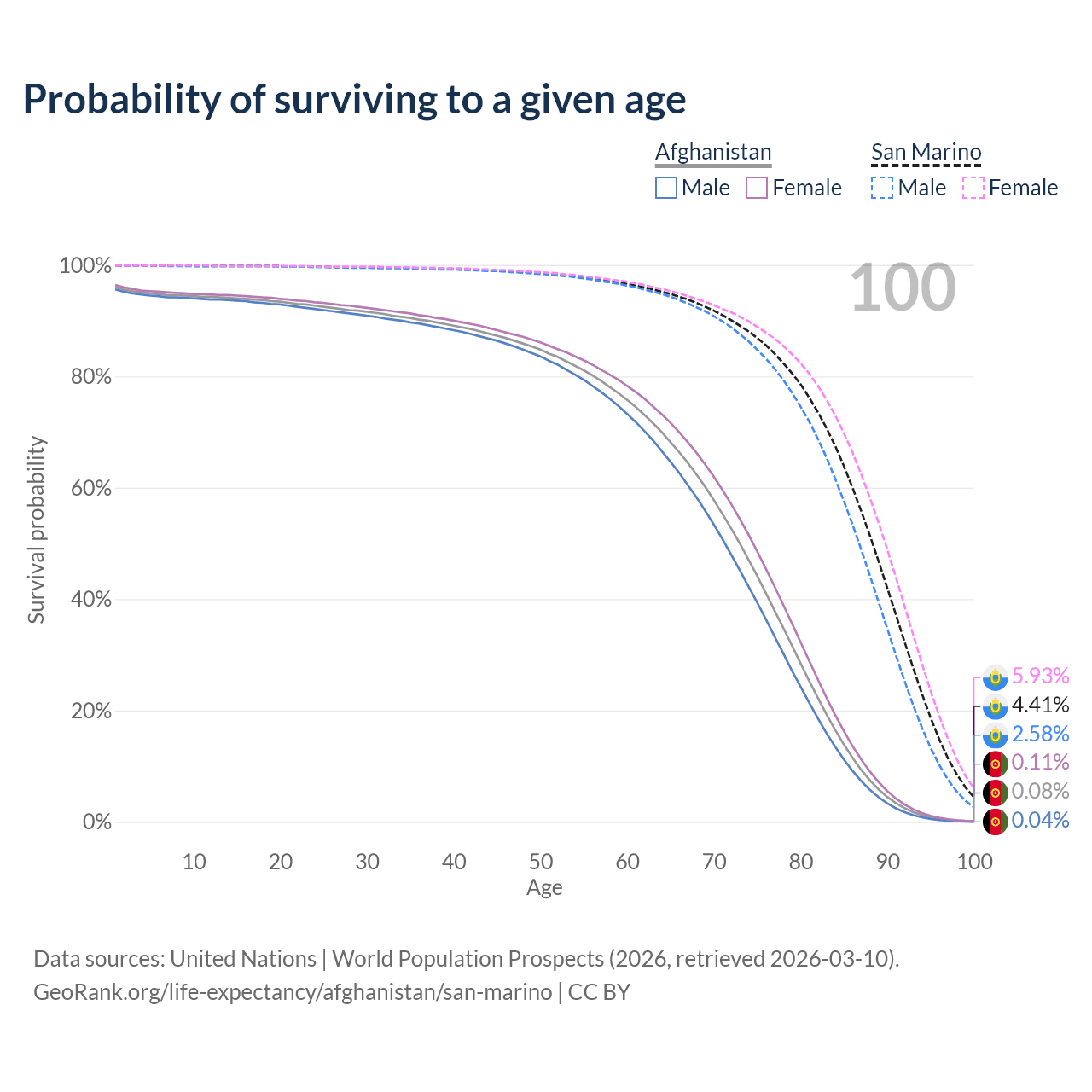 This life expectancy calculator shows the odds of living to 100, 95, 90, and below based on current age for both males and females in Afghanistan and San Marino, along with mean and median age of death. The calculations are based on the 2026 life tables (actuarial tables) from the UN World Population Prospects.