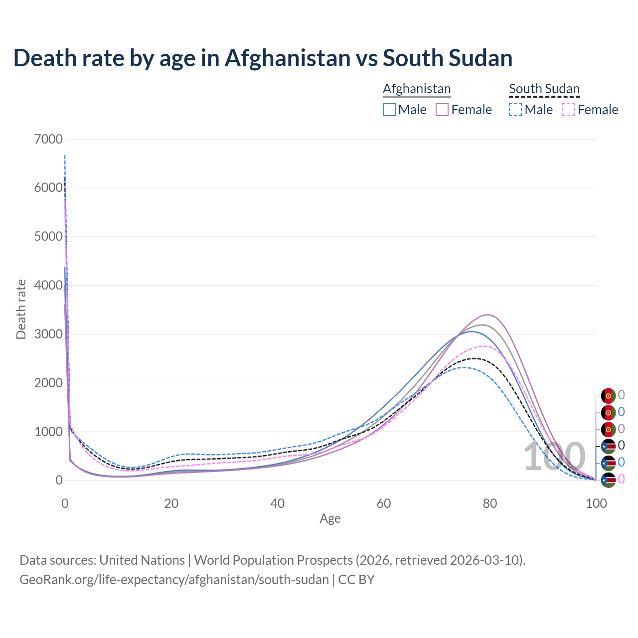 In Afghanistan, the most common age of death is 0, compared to 0 in South Sudan. The median age of death is 73 in Afghanistan and 67.5 in South Sudan, meaning only half of each cohort is expected to live past that age.