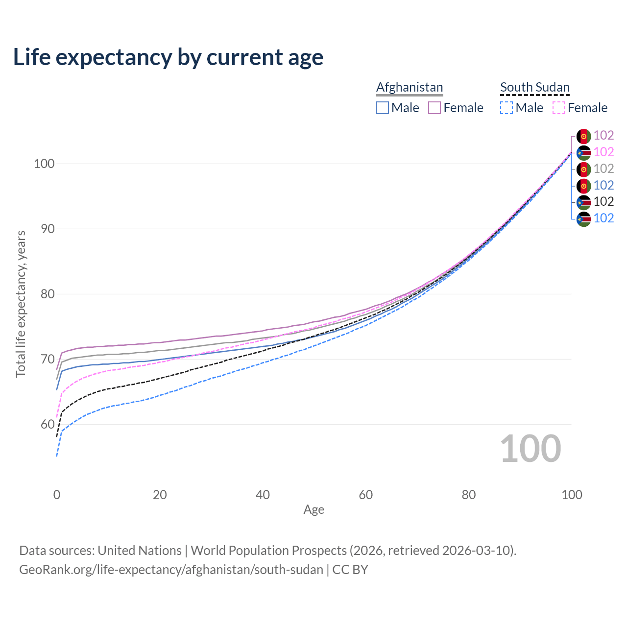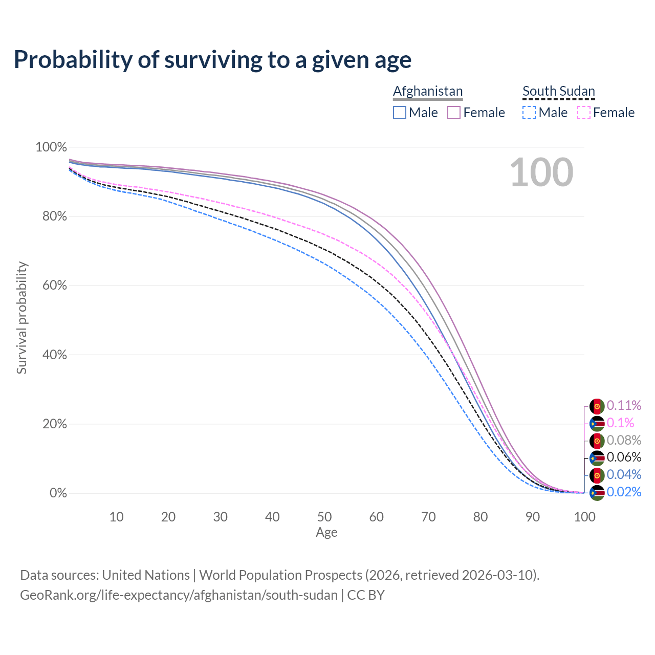 This life expectancy calculator shows the odds of living to 100, 95, 90, and below based on current age for both males and females in Afghanistan and South Sudan, along with mean and median age of death. The calculations are based on the 2026 life tables (actuarial tables) from the UN World Population Prospects.