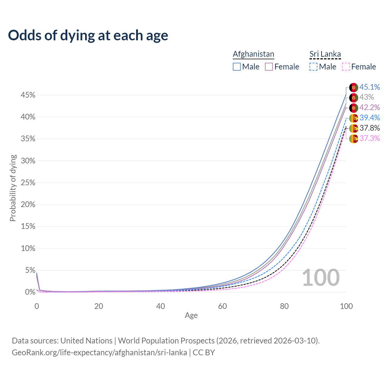 This life expectancy calculator shows the odds of living to 100, 95, 90, and below based on current age for both males and females in Afghanistan and Sri Lanka, along with mean and median age of death. The calculations are based on the 2026 life tables (actuarial tables) from the UN World Population Prospects.