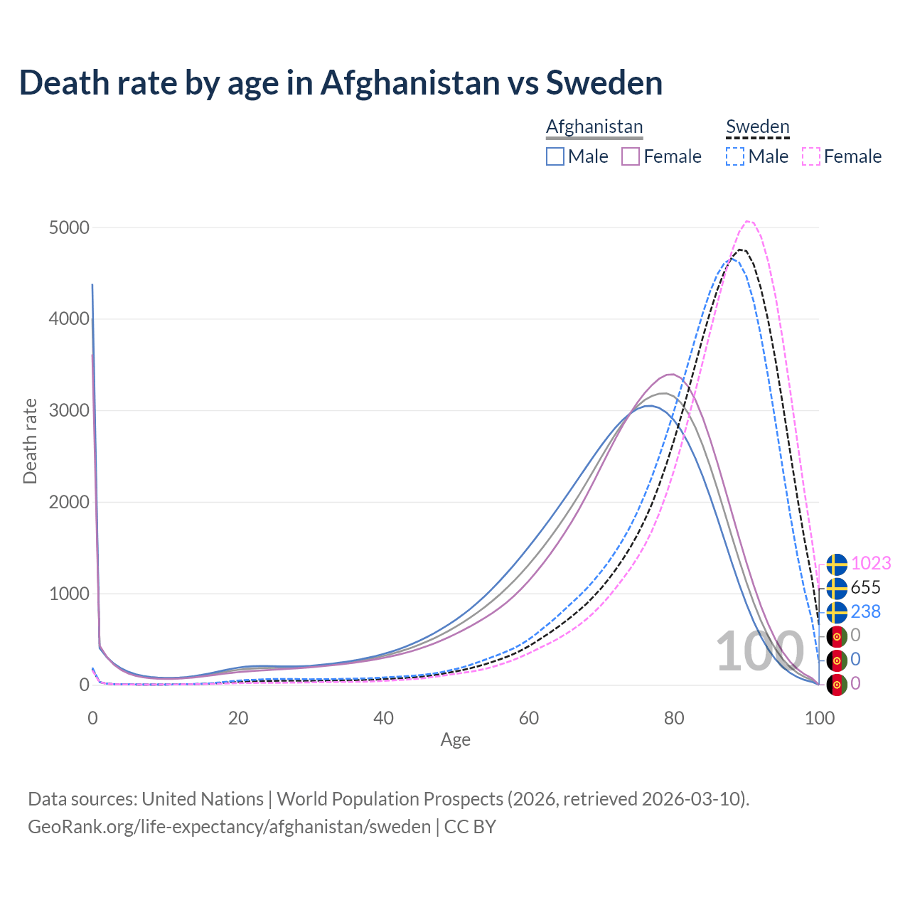 In Afghanistan, the most common age of death is 0, compared to 89 in Sweden. The median age of death is 73 in Afghanistan and 86.5 in Sweden, meaning only half of each cohort is expected to live past that age.