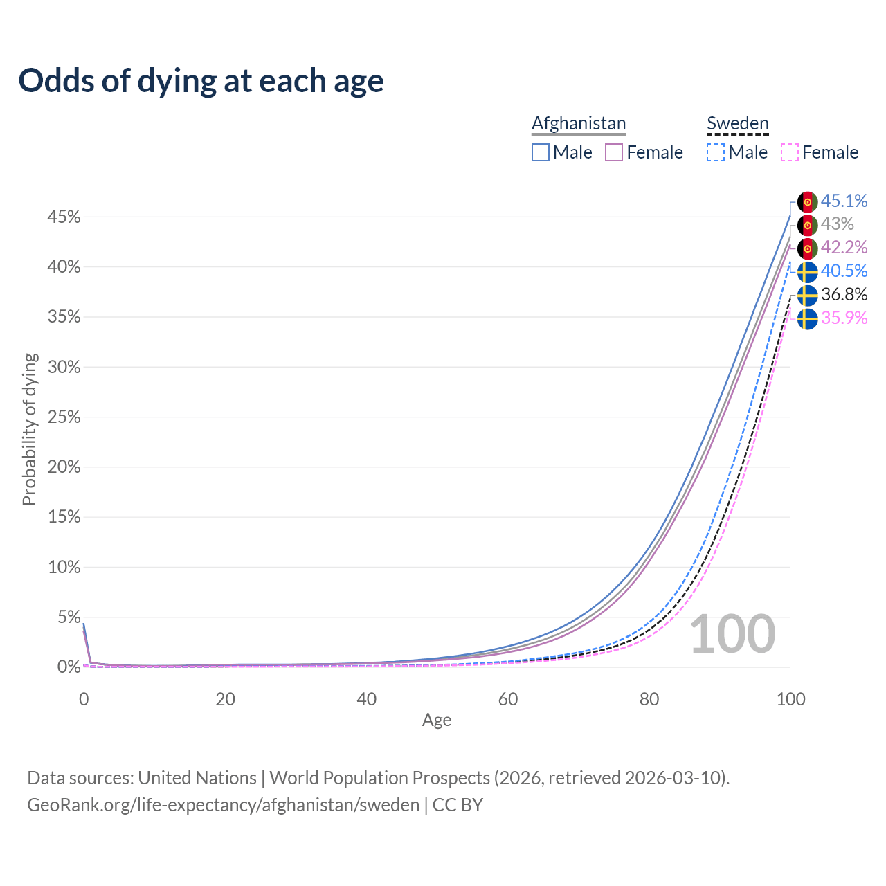 This life expectancy calculator shows the odds of living to 100, 95, 90, and below based on current age for both males and females in Afghanistan and Sweden, along with mean and median age of death. The calculations are based on the 2026 life tables (actuarial tables) from the UN World Population Prospects.
