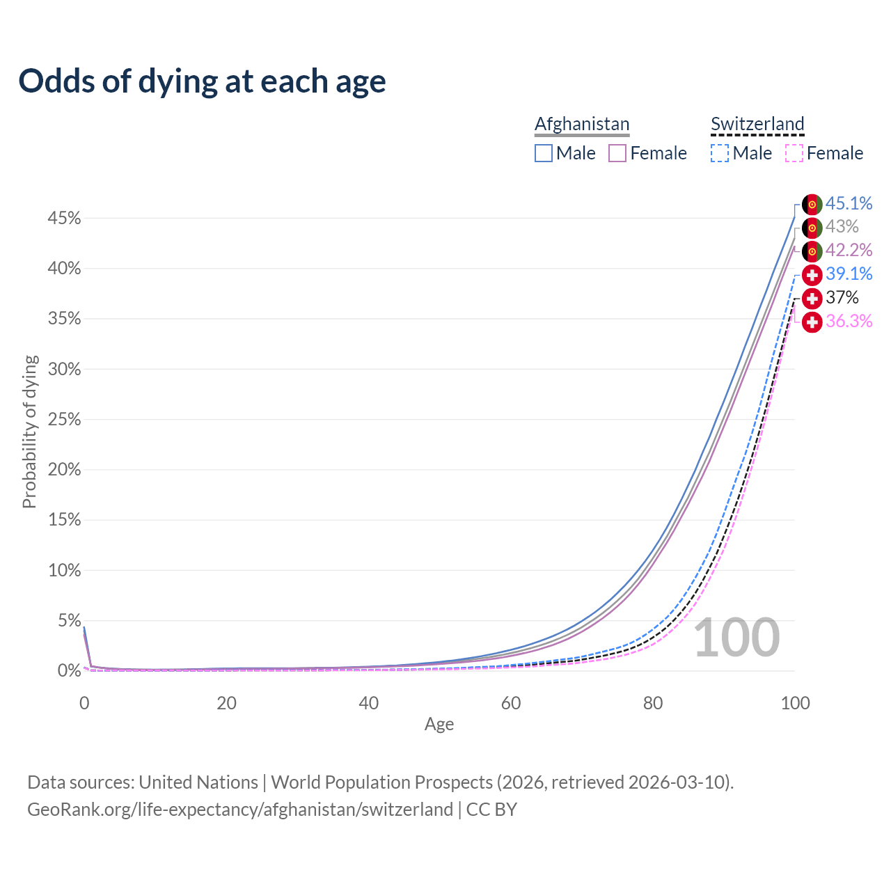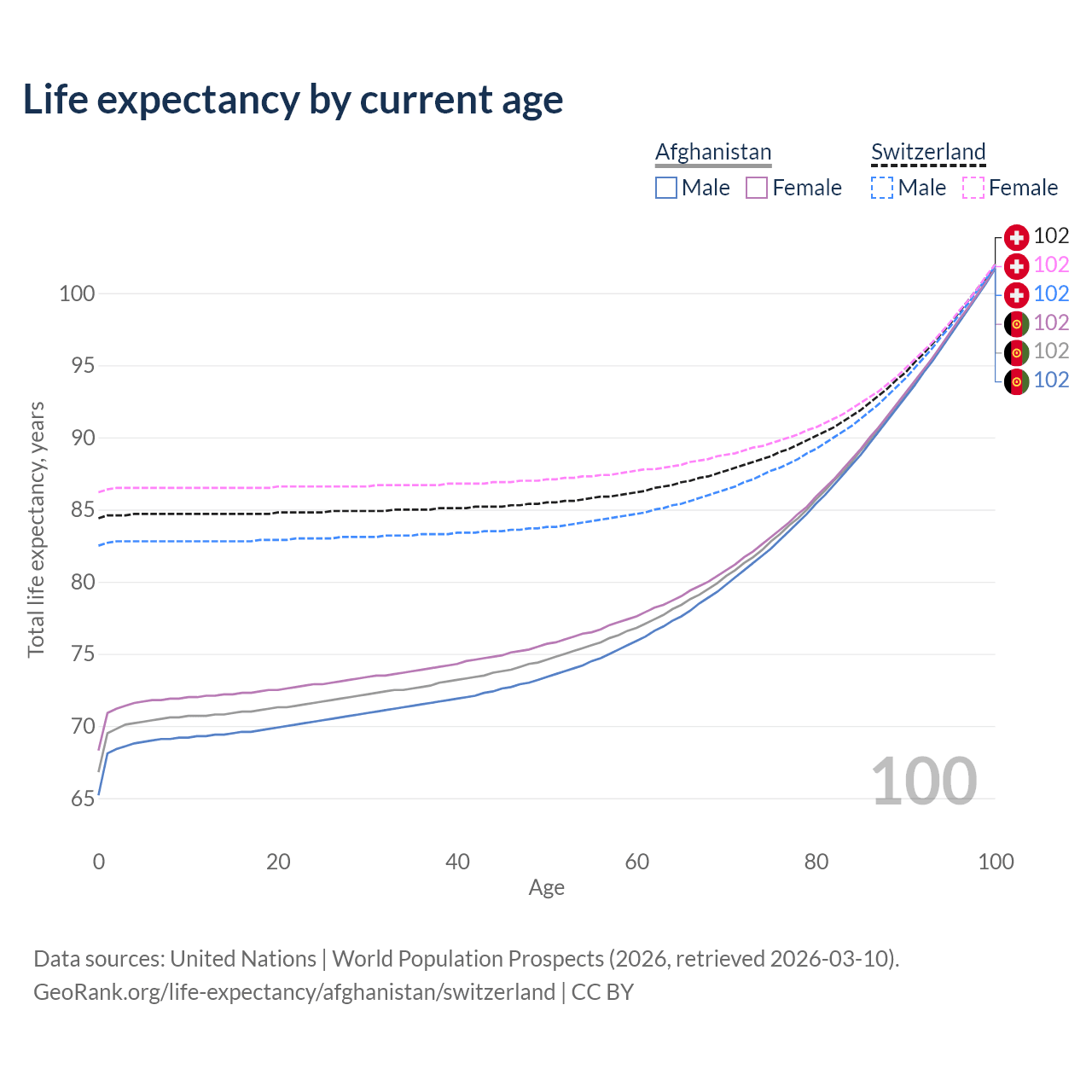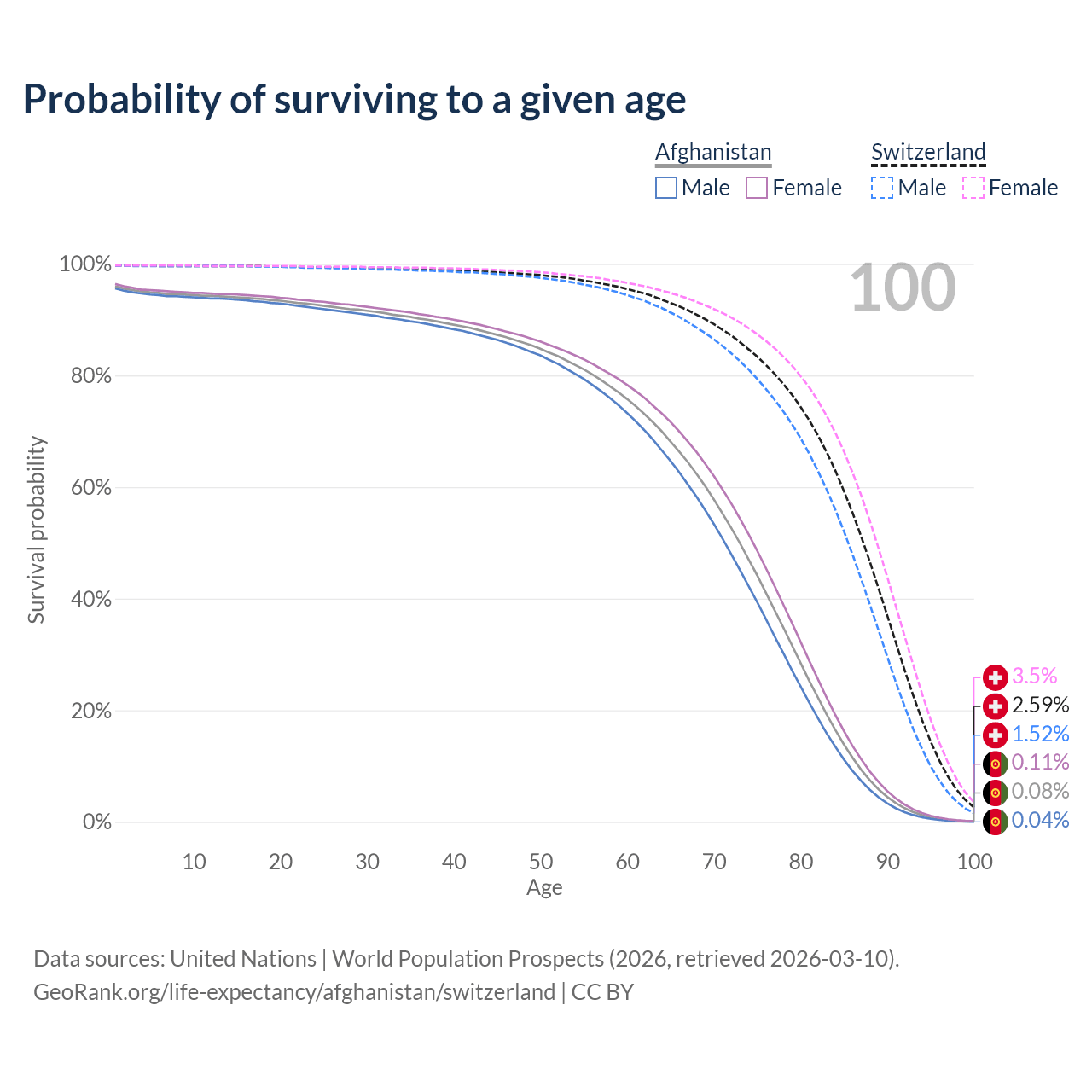 This life expectancy calculator shows the odds of living to 100, 95, 90, and below based on current age for both males and females in Afghanistan and Switzerland, along with mean and median age of death. The calculations are based on the 2026 life tables (actuarial tables) from the UN World Population Prospects.