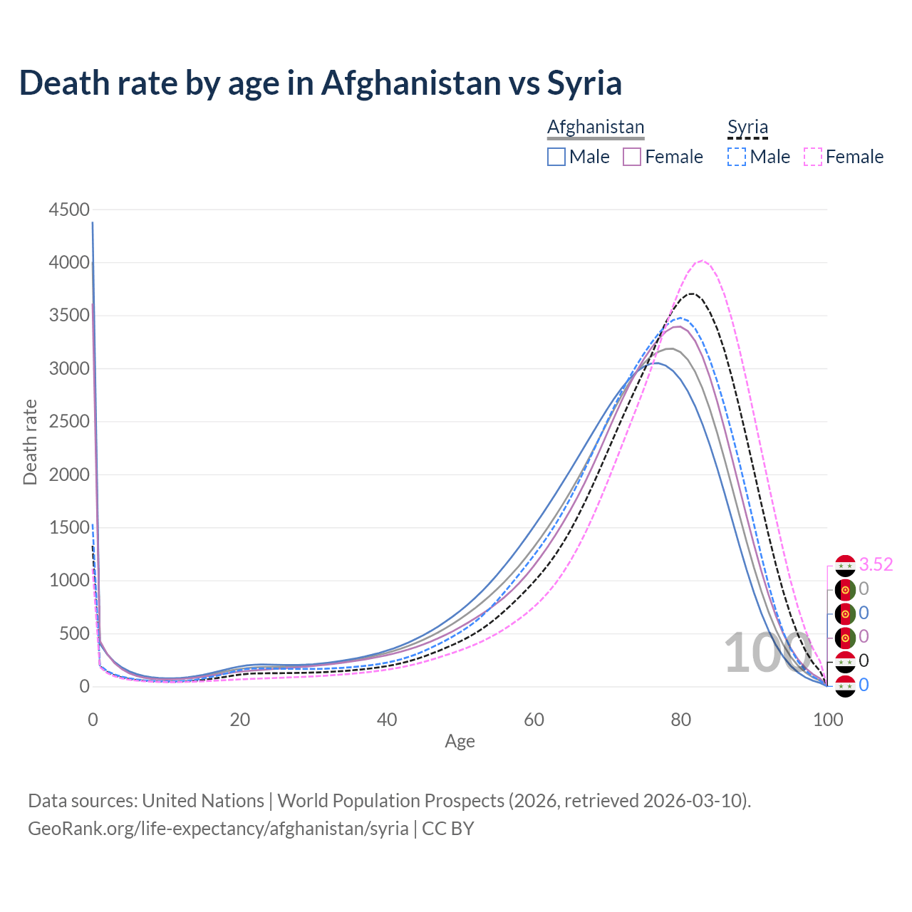 In Afghanistan, the most common age of death is 0, compared to 82 in Syria. The median age of death is 73 in Afghanistan and 77.7 in Syria, meaning only half of each cohort is expected to live past that age.