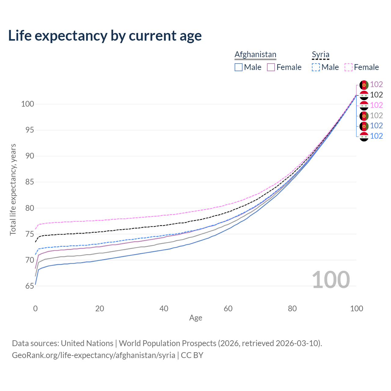 This life expectancy calculator shows the odds of living to 100, 95, 90, and below based on current age for both males and females in Afghanistan and Syria, along with mean and median age of death. The calculations are based on the 2026 life tables (actuarial tables) from the UN World Population Prospects.