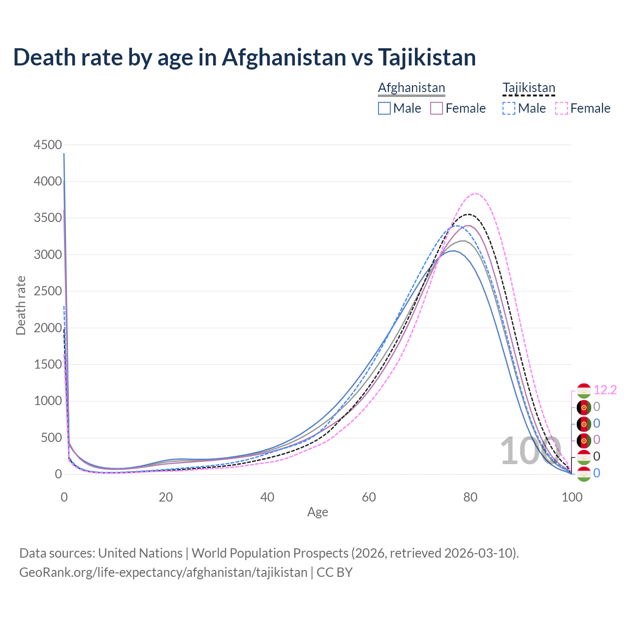 In Afghanistan, the most common age of death is 0, compared to 80 in Tajikistan. The median age of death is 73 in Afghanistan and 76 in Tajikistan, meaning only half of each cohort is expected to live past that age.