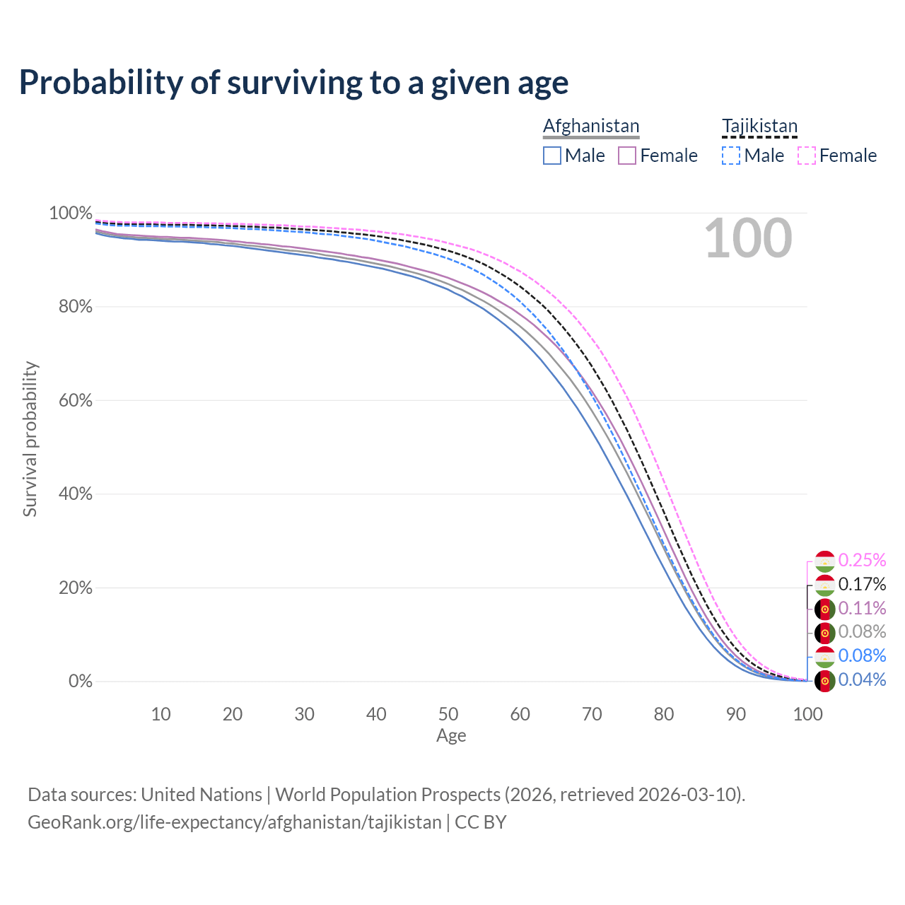 This life expectancy calculator shows the odds of living to 100, 95, 90, and below based on current age for both males and females in Afghanistan and Tajikistan, along with mean and median age of death. The calculations are based on the 2026 life tables (actuarial tables) from the UN World Population Prospects.