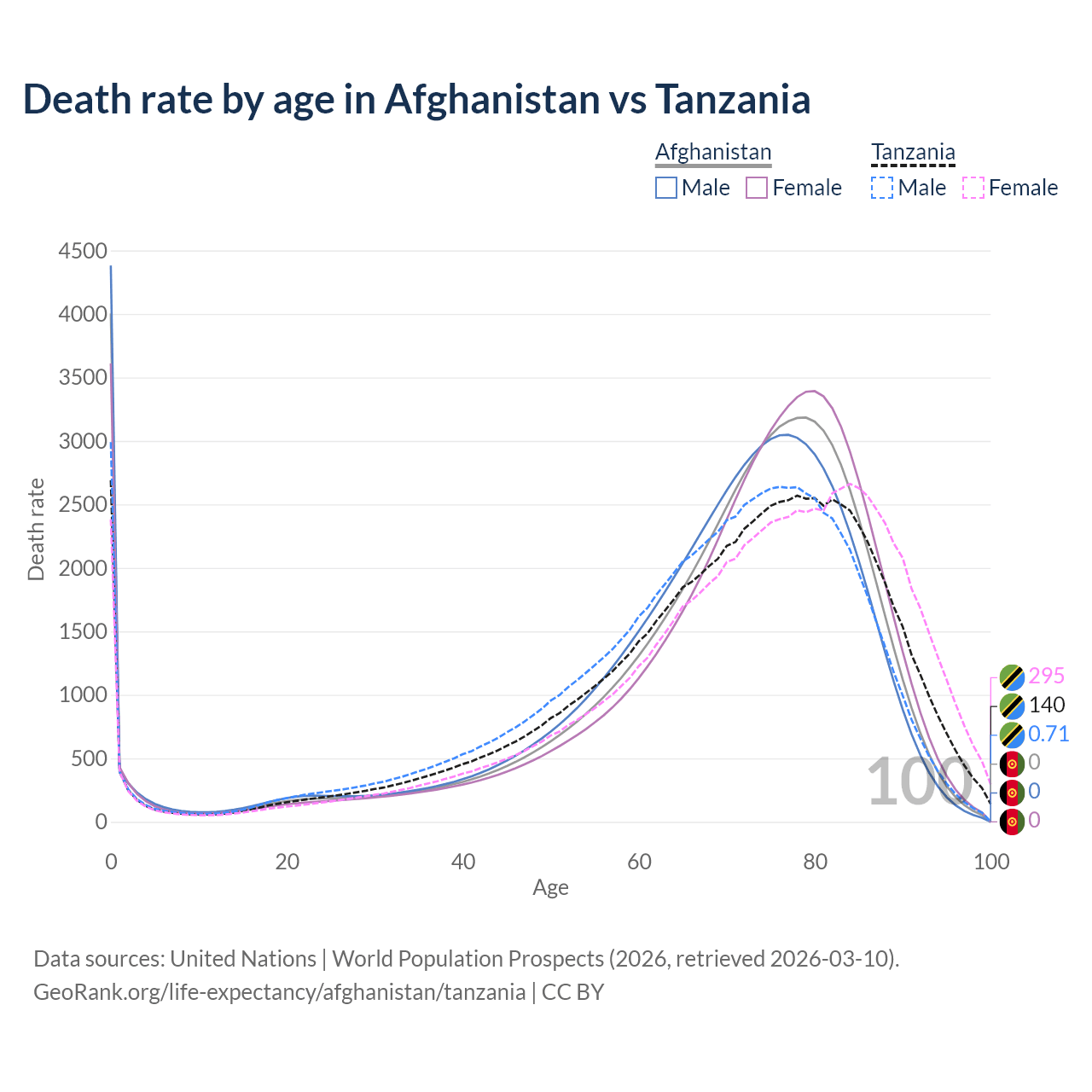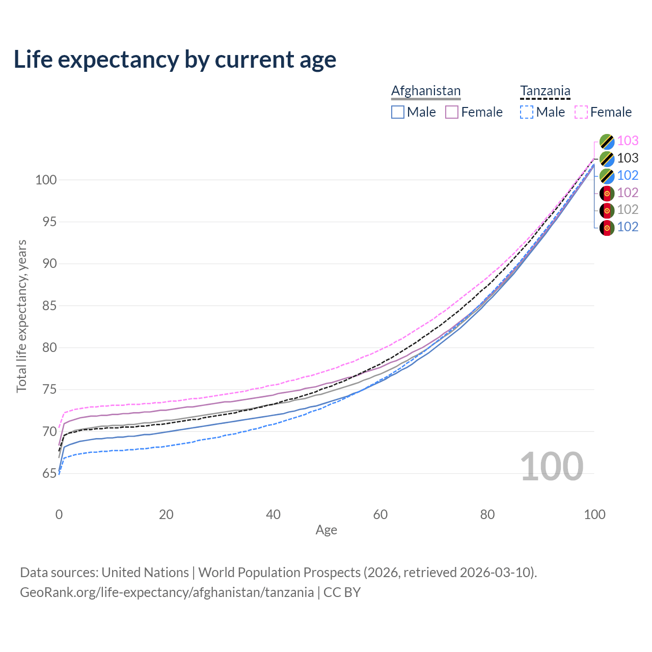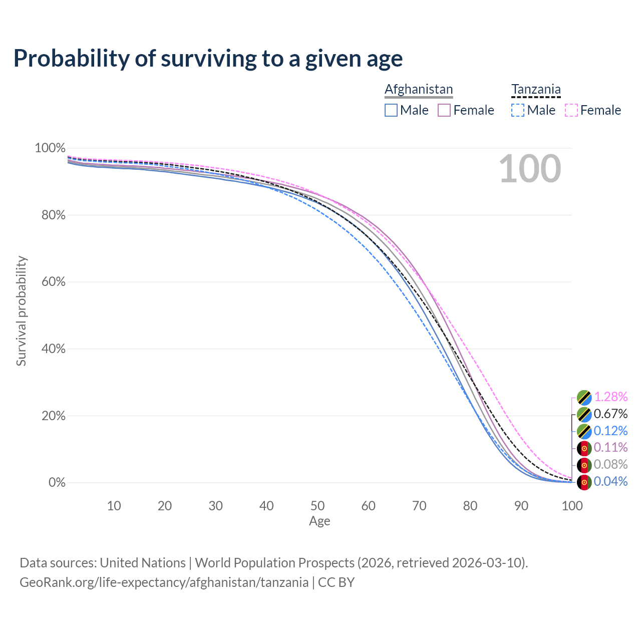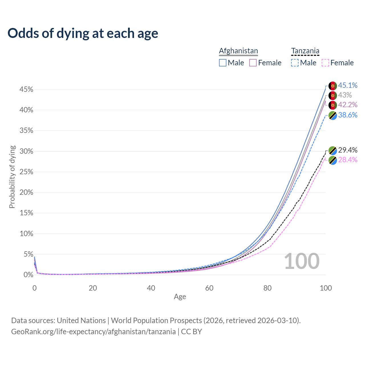 This life expectancy calculator shows the odds of living to 100, 95, 90, and below based on current age for both males and females in Afghanistan and Tanzania, along with mean and median age of death. The calculations are based on the 2026 life tables (actuarial tables) from the UN World Population Prospects.