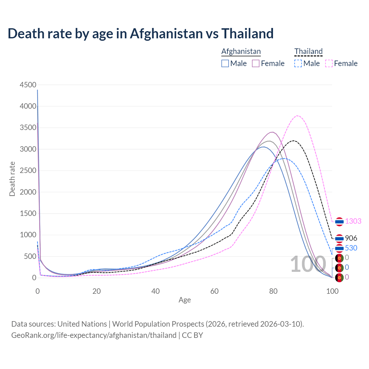 In Afghanistan, the most common age of death is 0, compared to 87 in Thailand. The median age of death is 73 in Afghanistan and 81.8 in Thailand, meaning only half of each cohort is expected to live past that age.